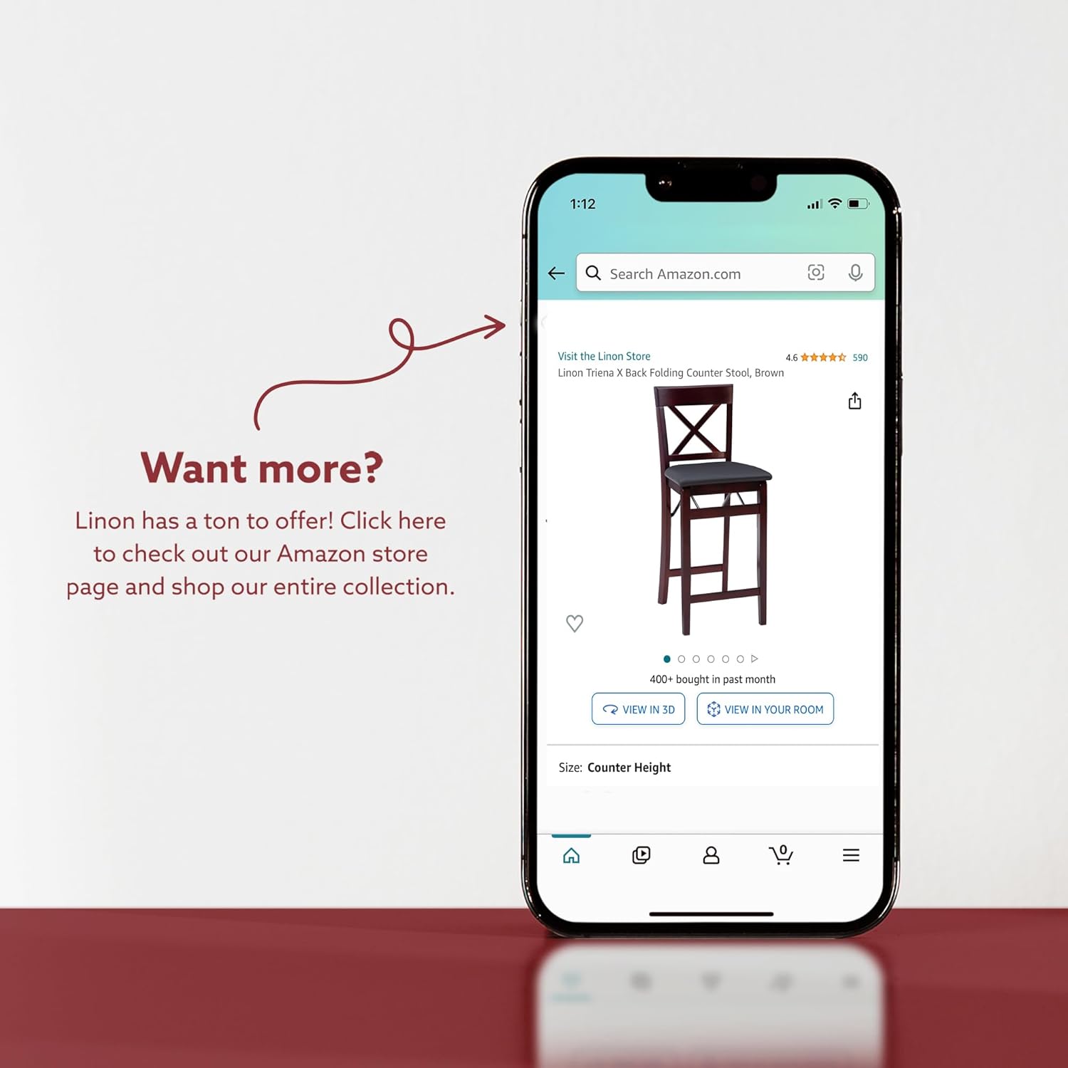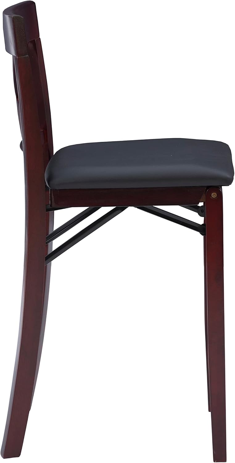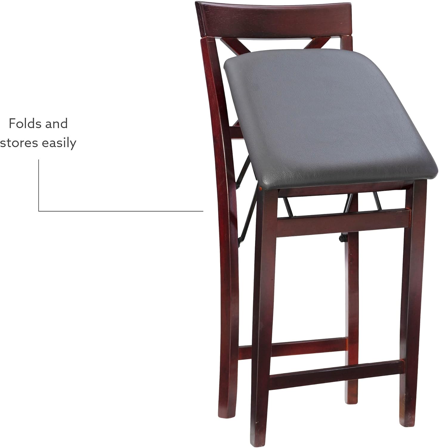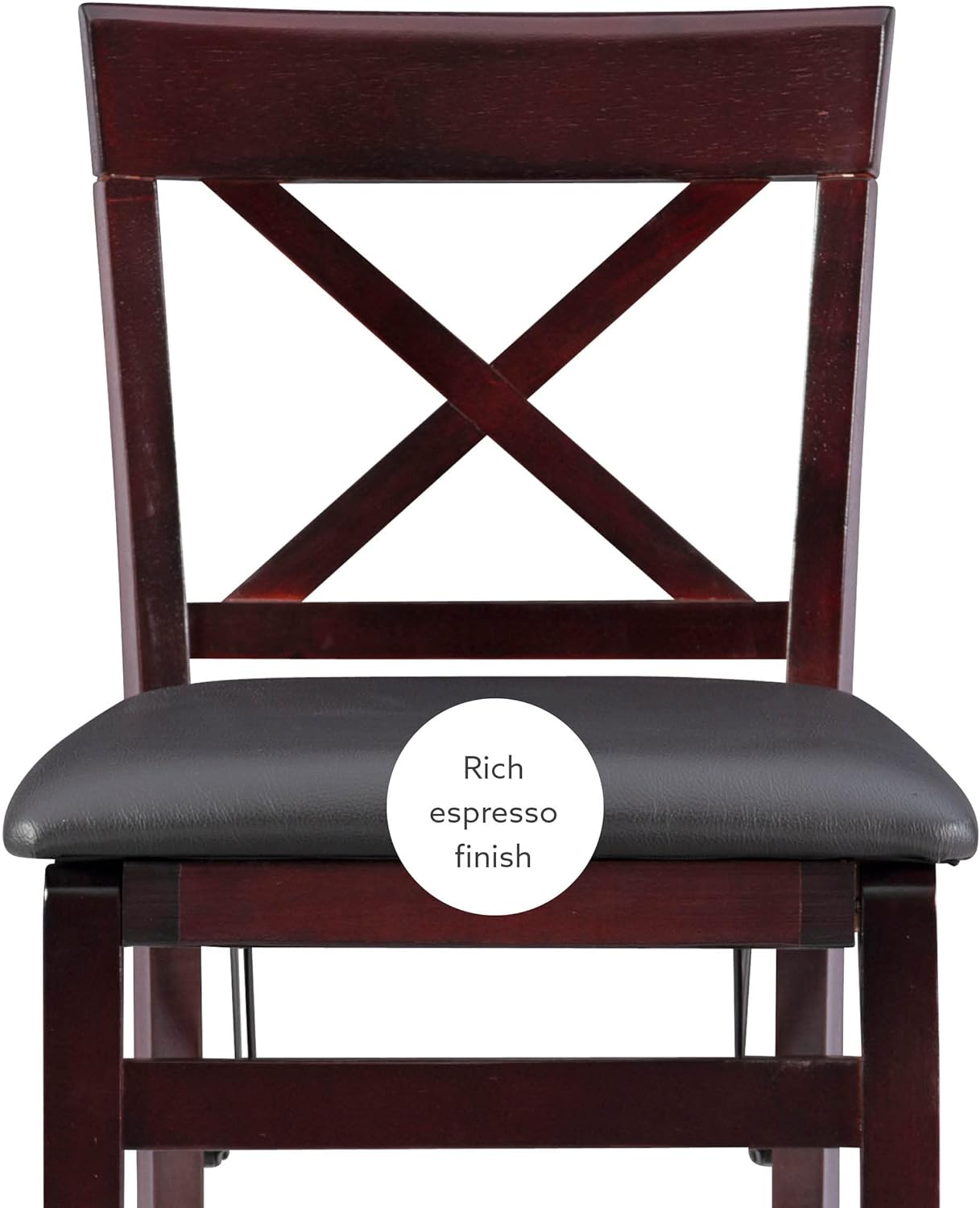 The elegance and unique style of this x back folding counter stool will carry throughout your kitchen, dining, or home pub area. Finished in a rich merlot, the seat is upholstered in a wipe clean brown faux leather. The folding feature makes it simple to easily store the stool when space is needed. Front and rear supports provide stability. 24″ seat height. 275 pound weight limit.