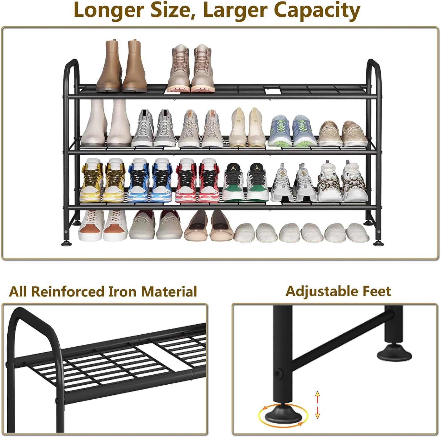 【Large Capacity】This 3-tier long shoe rack can easily stores up to 20-24 pairs of shoes for women, men, and children, such as slippers, sandals, high heels, sneakers, boots, etc. The raised bottom creates extra storage space for more shoes, ideal as a shoe rack for closet.