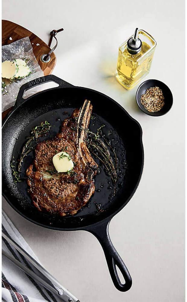 Thoughtfully Designed Cast-Iron Skillet: This 12-inch iron skillet showcases ergonomic handles, spatula-friendly sidewalls, and generous pour spouts