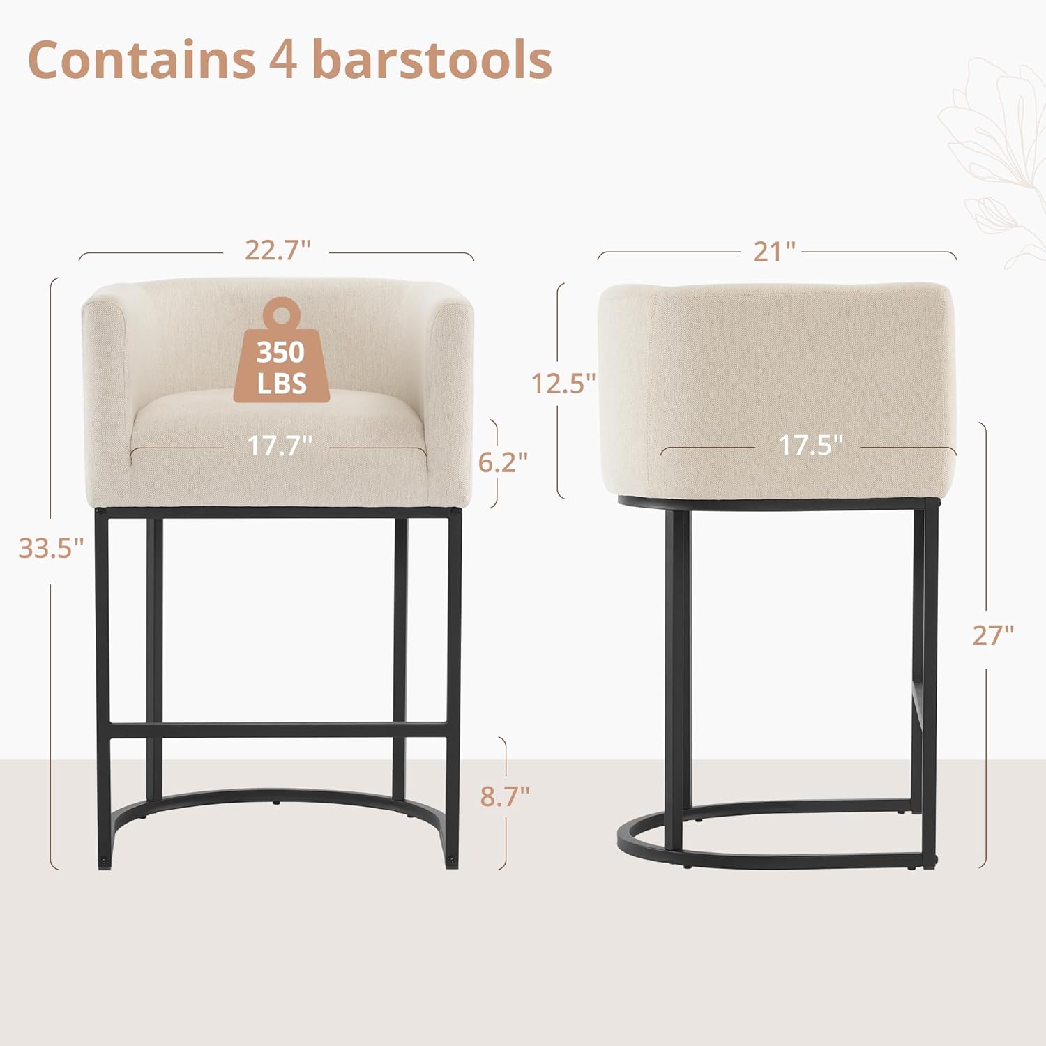 LUE BONA 27″ H Counter Height Bar Stools Set of 4, Modern Barrel Counter Stools with Backrest and Arms, Black Metal Frames, Linen Fabric Upholstered Accent Barstools for Kitchen Island, Linen Color
