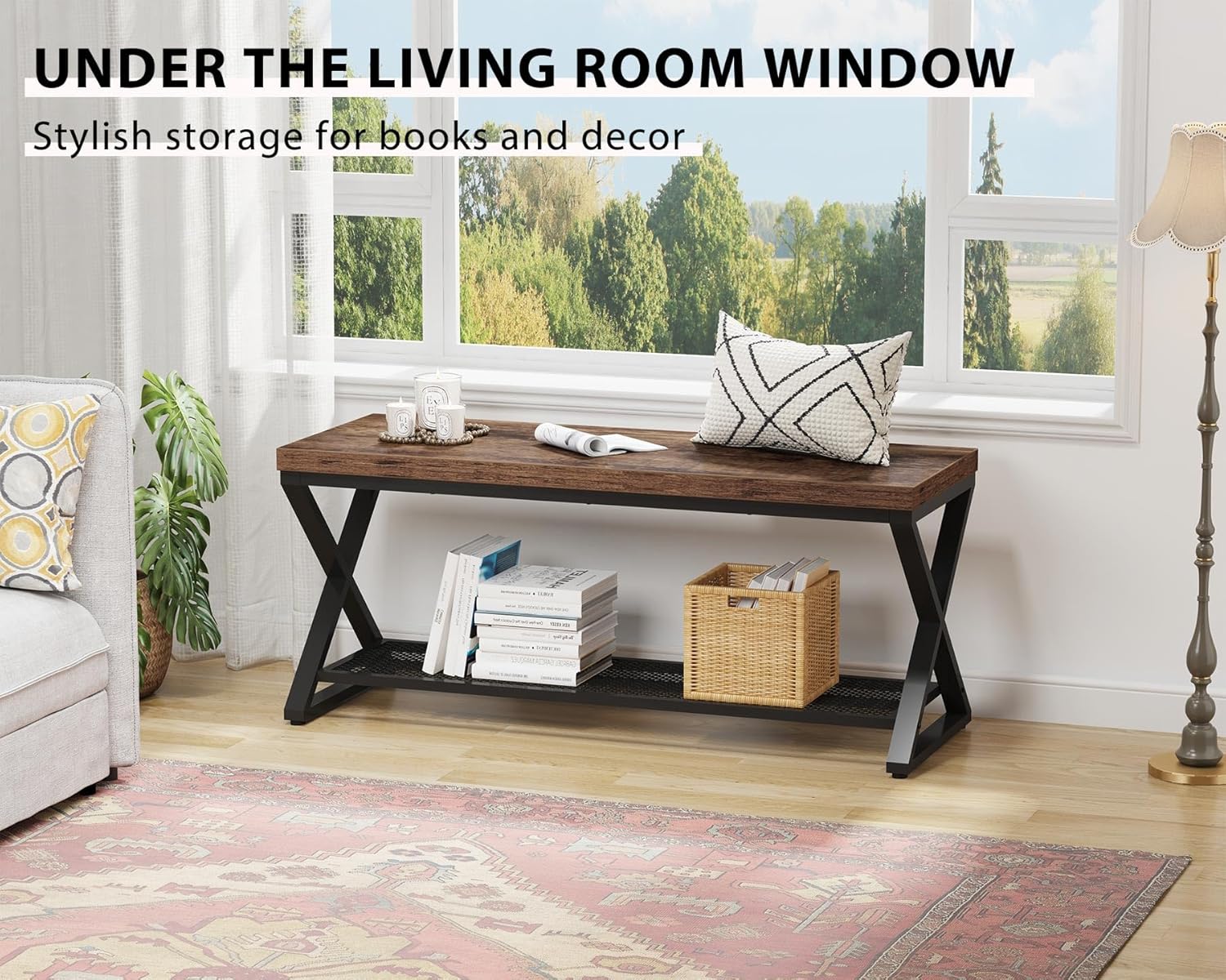 LVB Rustic Entryway Bench with Shoe Storage, Wooden and Metal Shoe Bench with Seating, Industrial Indoor Bench for Living Room Bedroom, Shoe Rack Bench for Foyer Hallway Entrance, Rustic Brown, 39 in