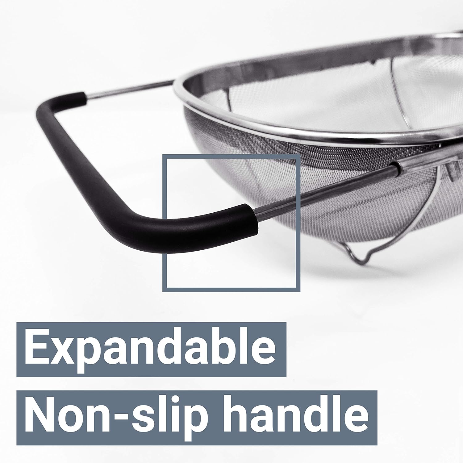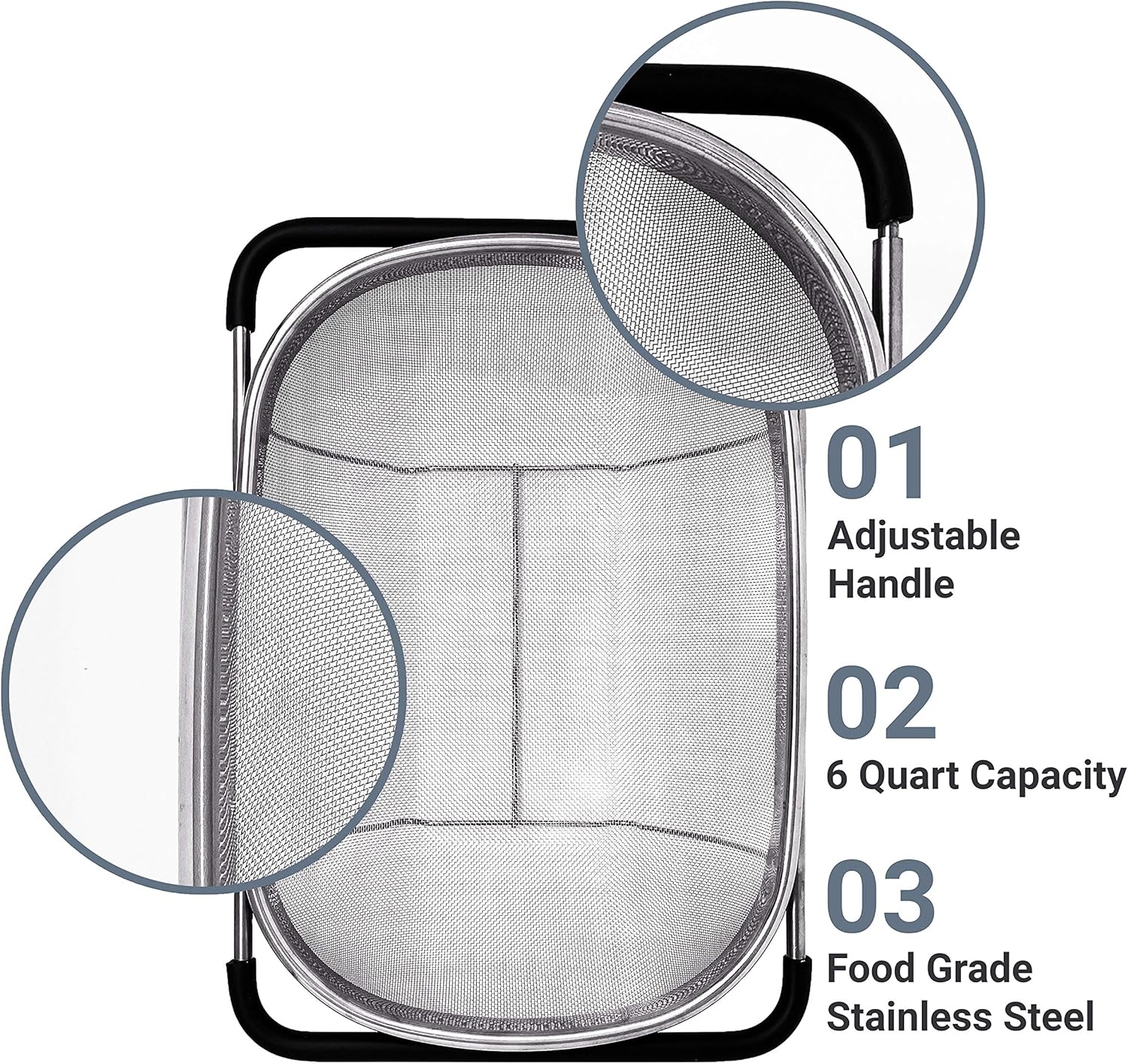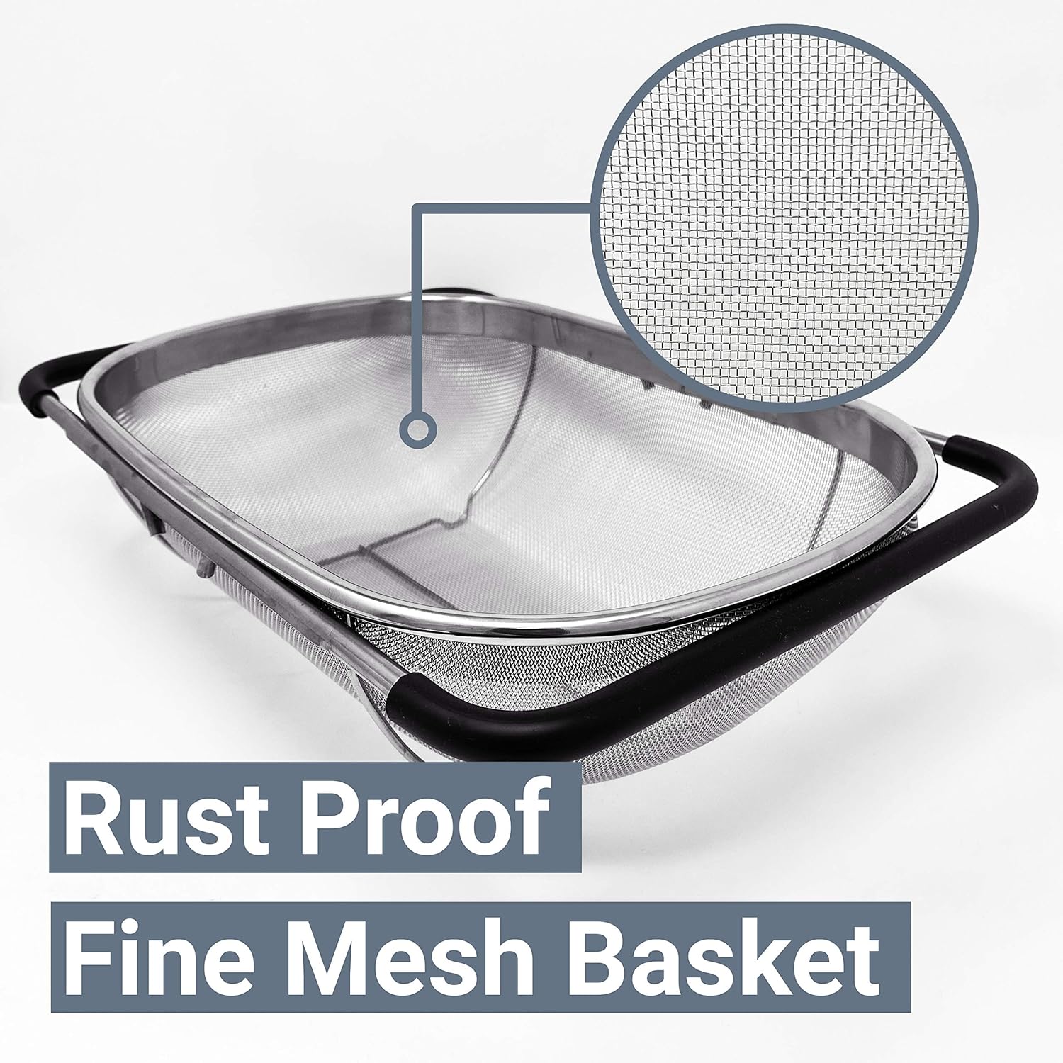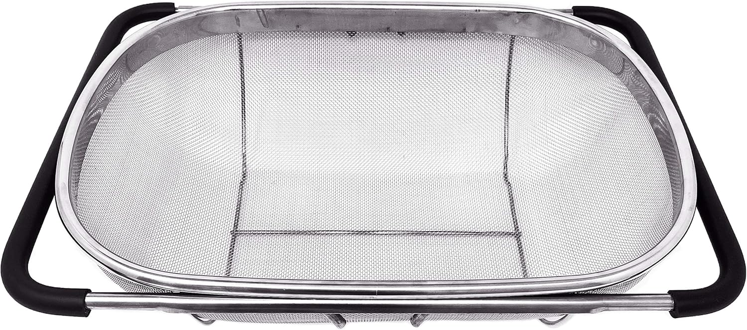 Makerstep Over the Sink Colander Strainer Basket Stainless Steel, For Kitchen Sink with Rubber Grip, Fine Mesh, Large Kitchen Gadgets Tools, Expandable Home Kitchen Essentials