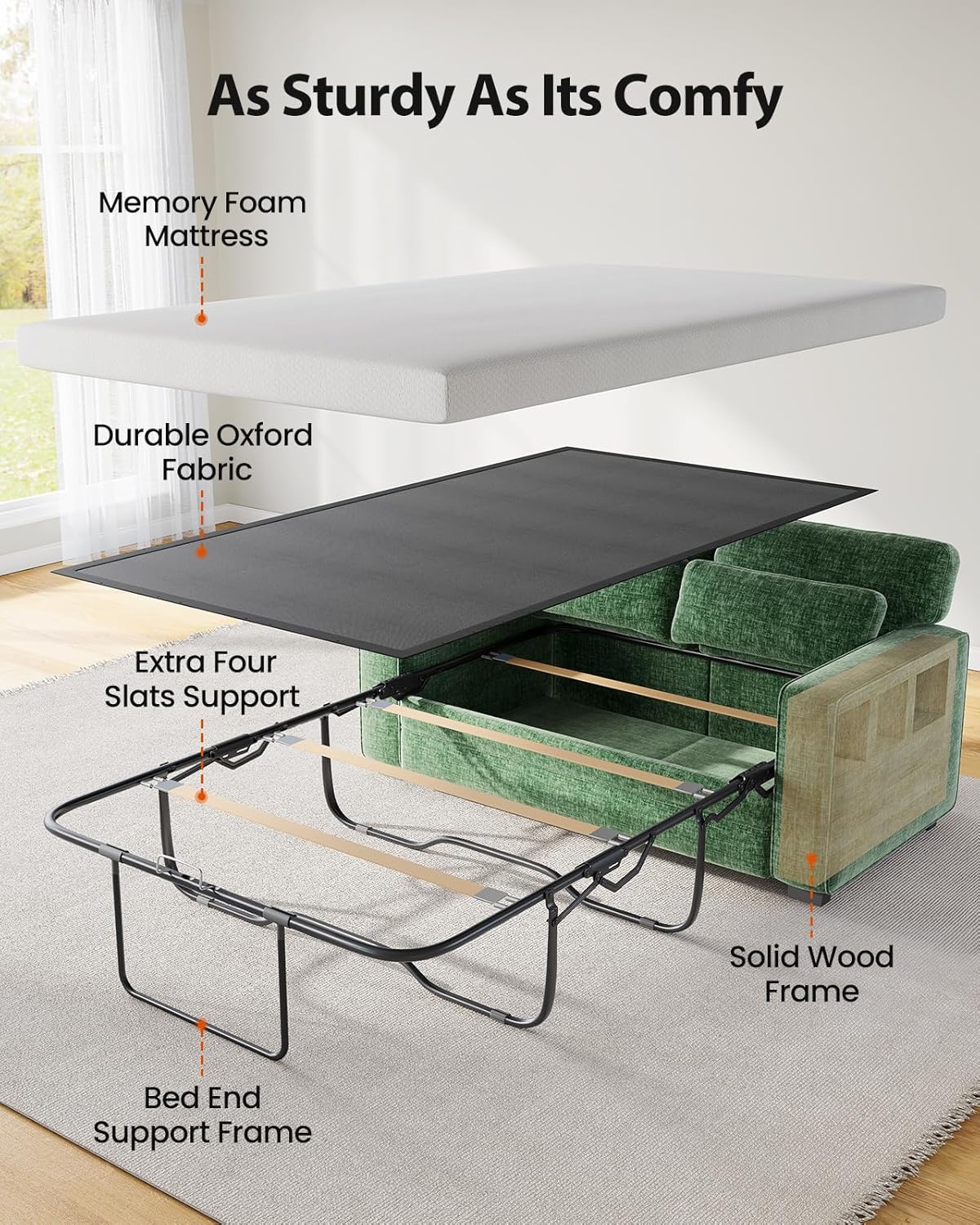 Strong Support Structure: This sofa holds up to 600 lbs with reinforced alloy frame, quality Oxford fabric and 4 extra wooden support beams. This stable couch bed eliminates wobbling and provides reliable durability for long-lasting use.