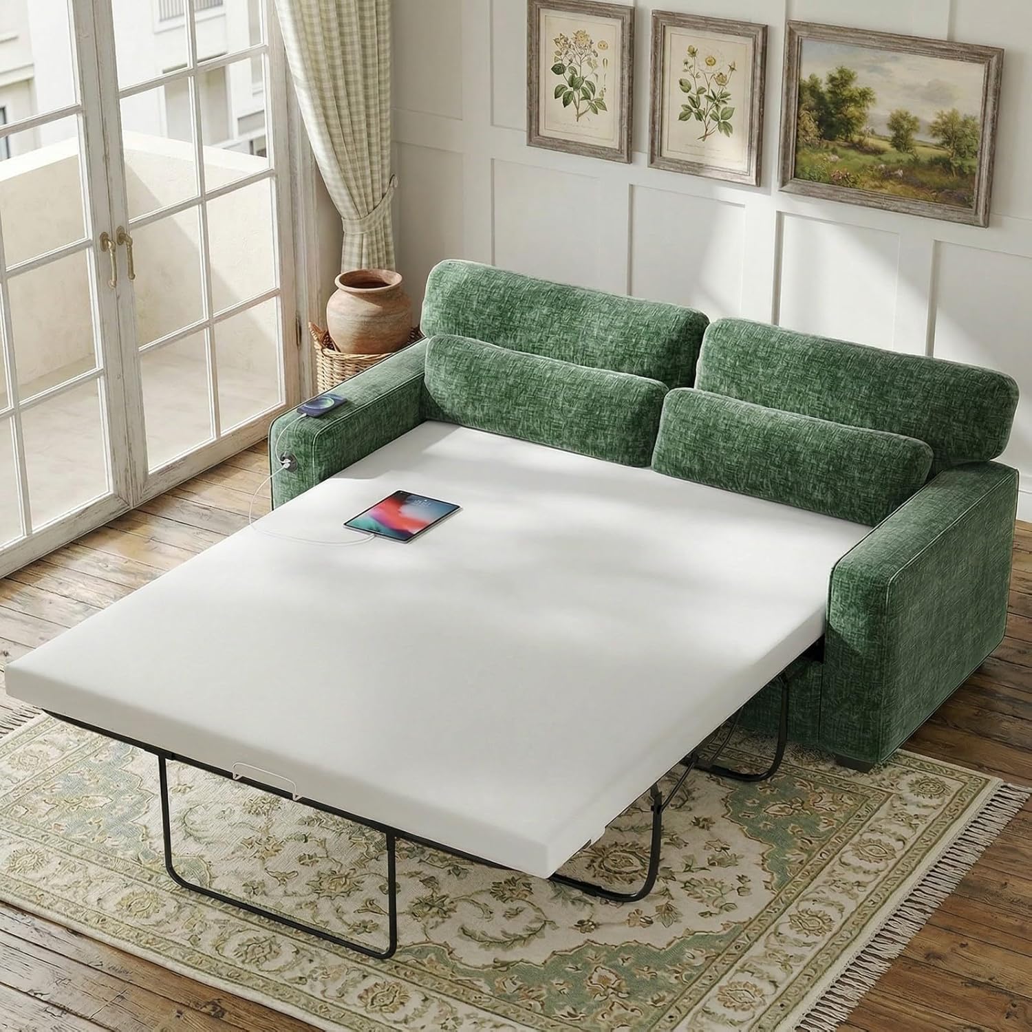 Marsail Pull Out Sofa Bed, Full Size Sleeper Sofa with Memory Foam Mattress, 2 USB Charging Ports & Removable Covers, Chenille Loveseat Couch for Living Room, Apartment, Green