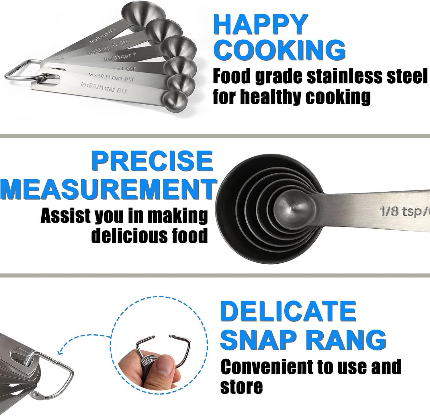 WELL-DESIGNED 6pc SET: Innovative round scoops fit nicely in seasoning jars and other small containers without spilling. 6pc sets included 1/8 teaspoon, 1/4 teaspoon, 1/2 teaspoon, 1 teaspoon, 1/ 2 tbsp, 1 tbsp, attached with D-ring helps keep all spoons together during cooking or baking. Measurements of each spoon are engraved on handle, never lose track of adding spices to your dishes