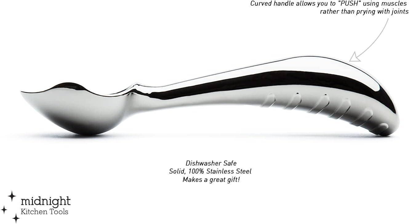 You Have Been Scooping Ice Cream Wrong – Instead of prying at hard ice cream with weak wrists, the Midnight Scoop allows you to ergonomically push into the ice cream using your arms and shoulders for more leverage and power. It Makes a Huge Difference!
