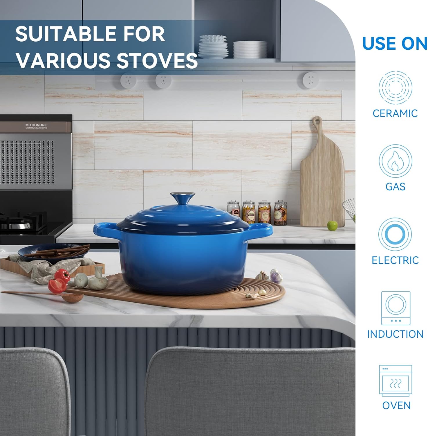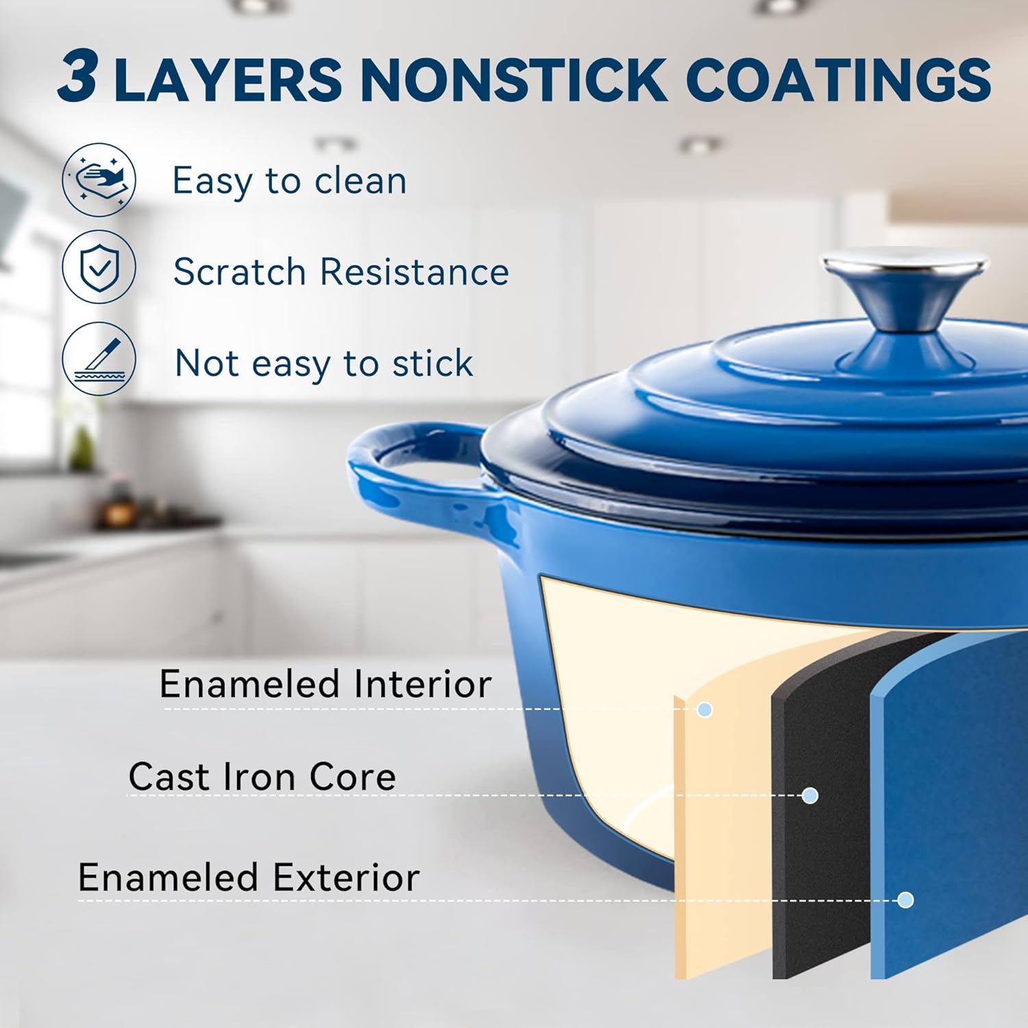 🍳LARGE 6 Quart CAPACITY:Our cast iron dutch oven can be used for multiple cooking methods such a cooking, baking, stewing etc.With this Large capacity enameled cast iron, can meet all the needs of family gatherings.The highest temperature tolerance is as high as 500°F.