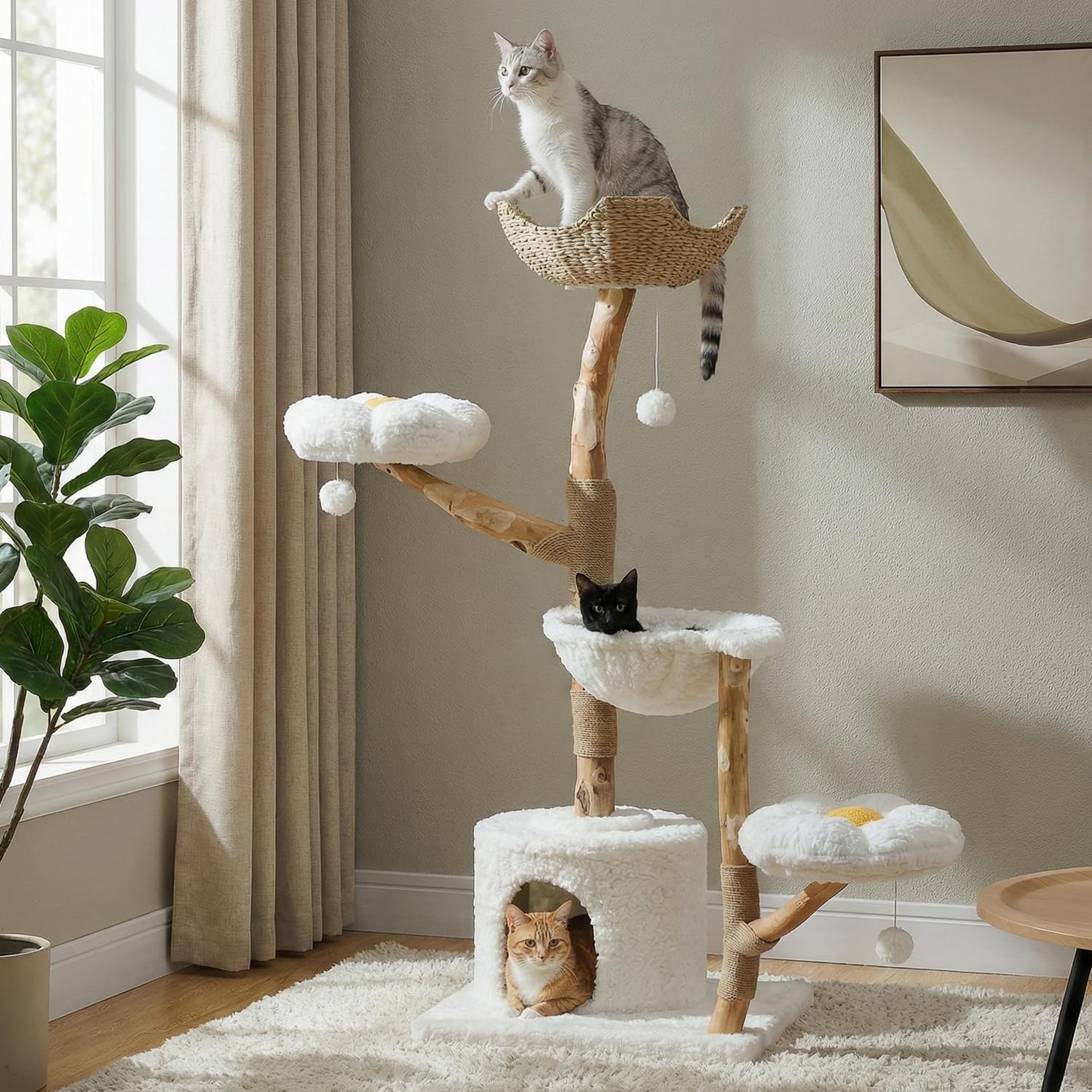 The cat tree’s posts and boards are made from FSC-Certified wood. LUXURY MEETS MODERN DESIGN: This 59-inch modern cat tree features natural pear wood branches, a handwoven top bed, two flower-shaped platforms, a cozy hammock, and a bottom den, all wrapped in soft white cloud fleece fabric. Your cat will feel like walking on clouds while the design complements your furniture and adds a luxurious touch to your home.
