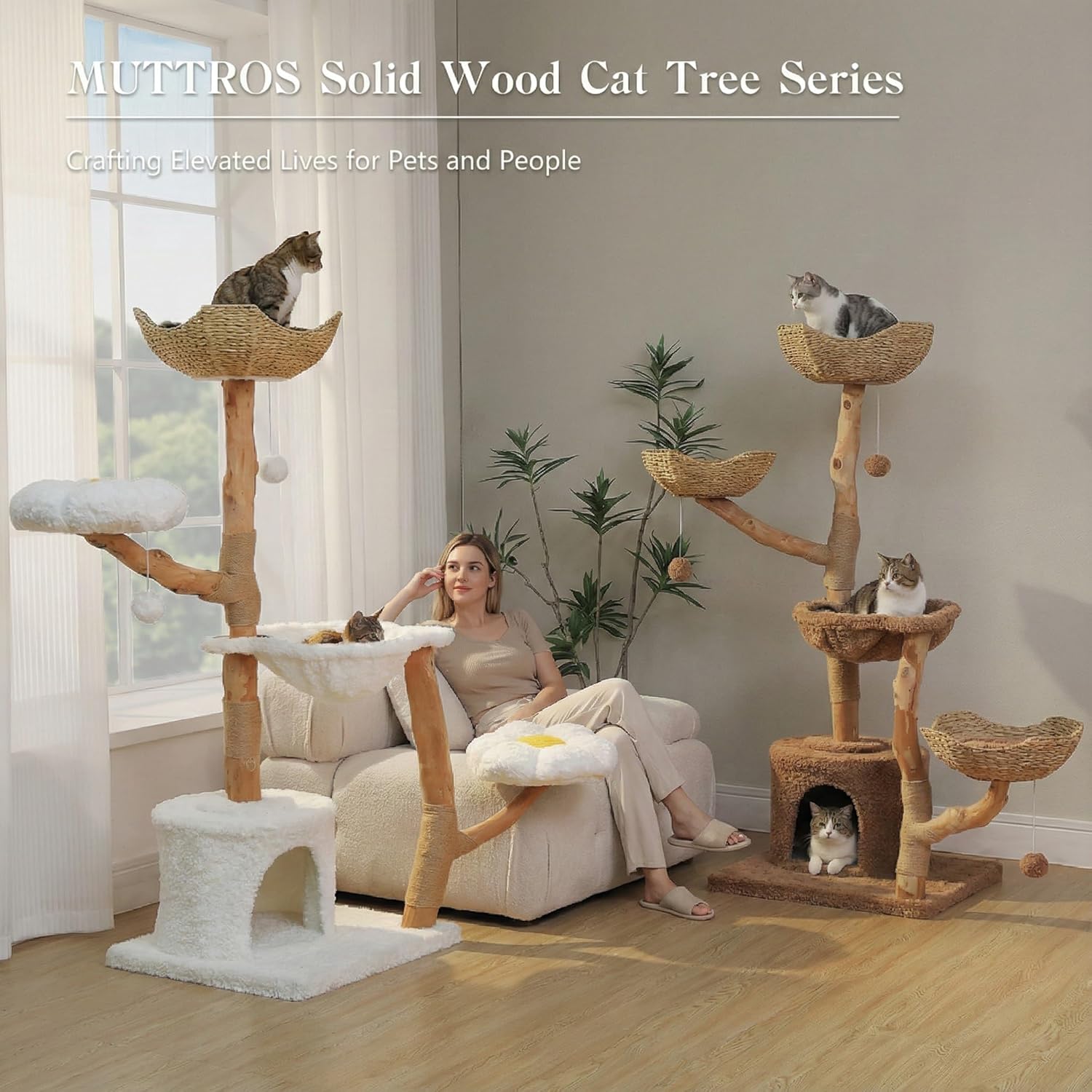 MUTTROS 59″ Modern Cat Tree Tower for Large Cats w/2 Flower Perches-Natural Solid Wood Scratching Post with Real Branch-Luxury Boho Cat Furniture w/Condo & Wicker Basket Bed, Cloud White