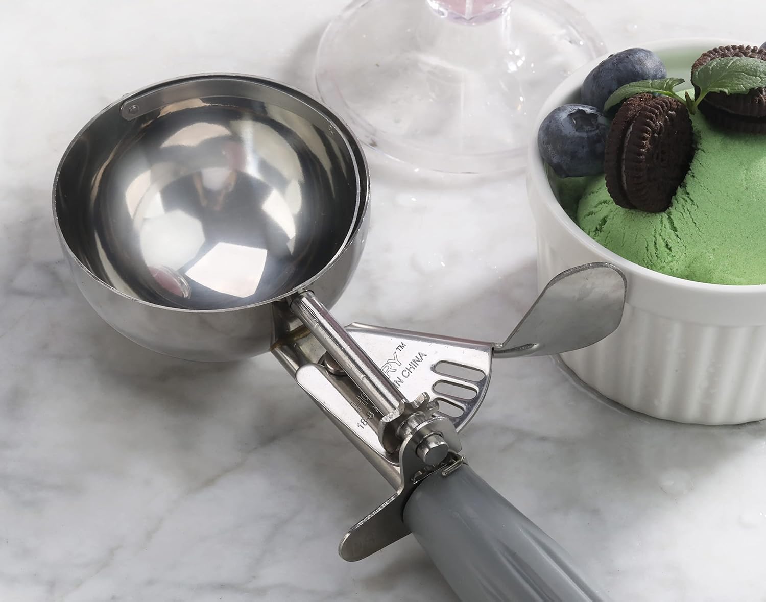 New Star Foodservice 34769 Commercial-Grade Thumb Press Food Disher/Ice Cream Scoop, 18/8 Stainless Steel, 4 oz, Size 8, Grey