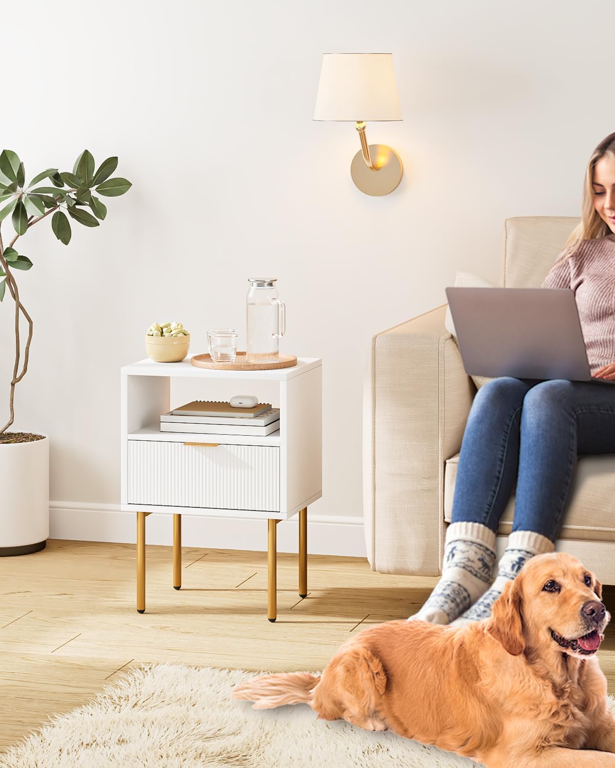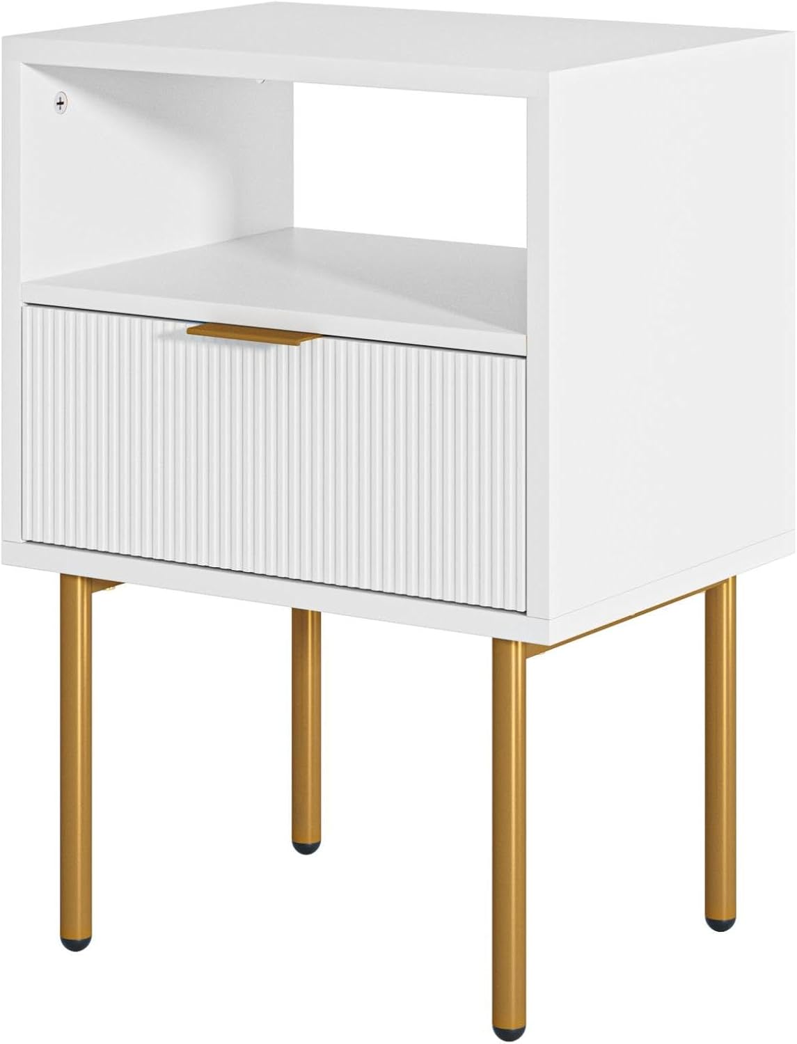 Nightstand,Morden Bedside Table with Gold Frame,Small White Night Stand,End Table,Bedside Furniture,Side Table with Drawer and Shelf for Bedroom,Living Room (1Drawer, White)