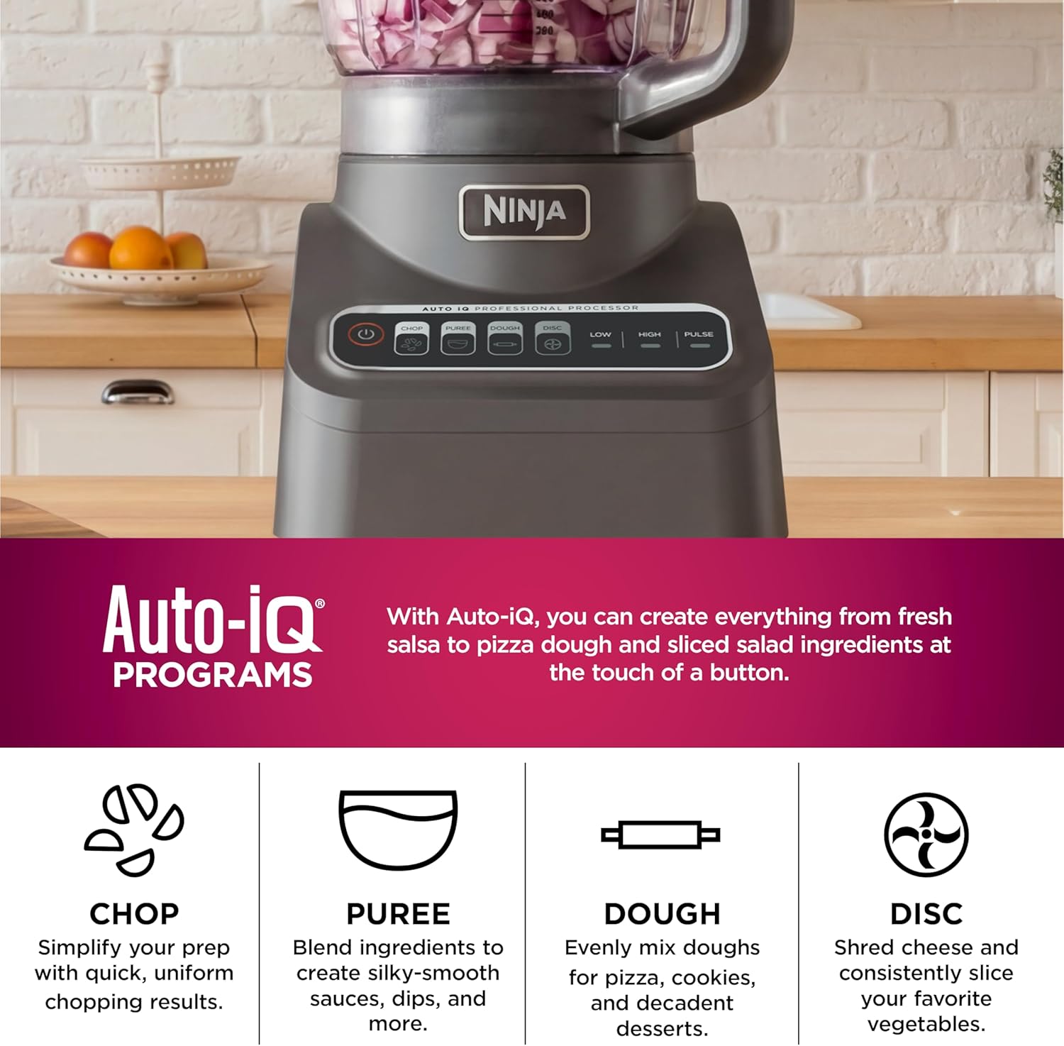 AUTO-IQ TECHNOLOGY: Features 4 Auto-iQ intelligent preset programs that take the guesswork out of food prep, providing one-touch control for chopping, slicing, pureeing, and dough making.