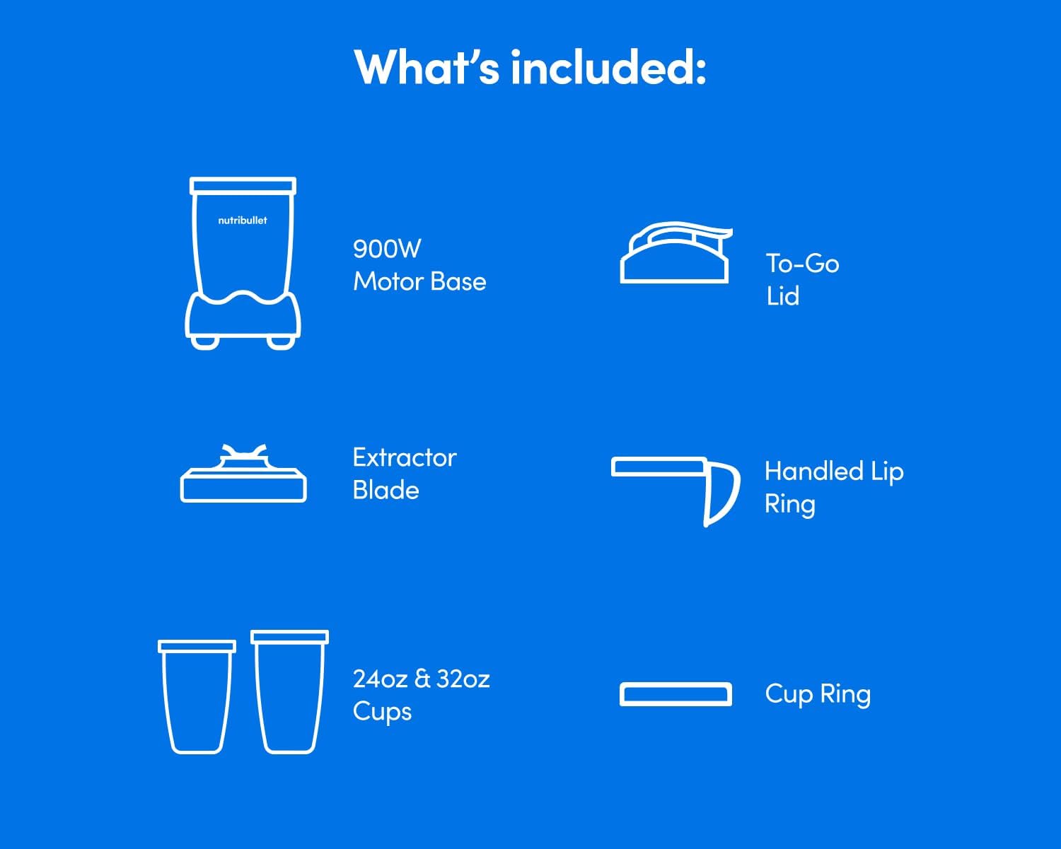 Included: (1) 900W Motor Base, (1) Extractor Blade, (1) 32 oz (900ml) Cup, (1) 24 oz (700ml)Cup, (1) To-Go Lid, (1) Lip Ring, (1) Lip Ring with Handle and User Guide