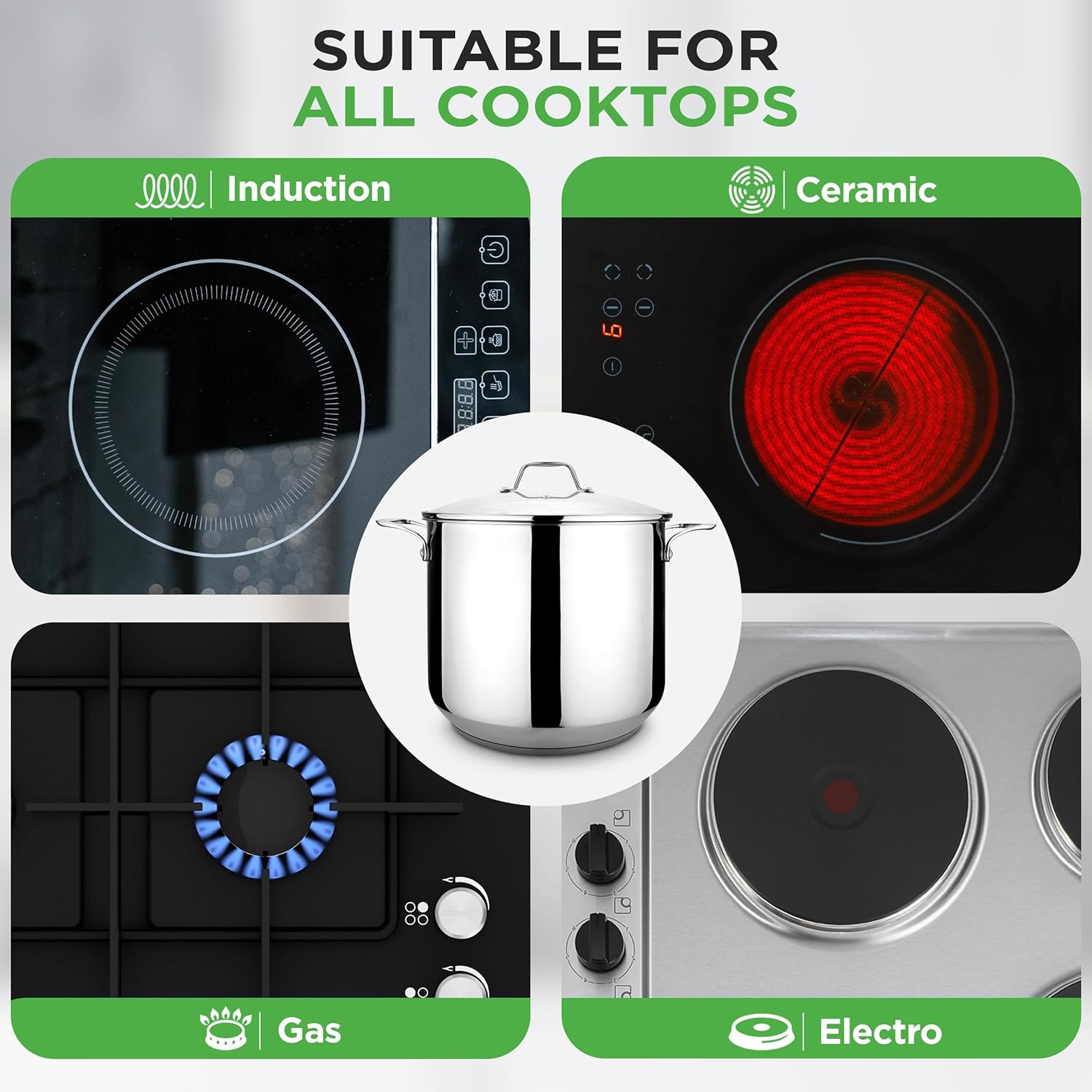 INDUCTION READY: The heavy duty stainless steel stock pot is designed for safe use in electric, gas, induction, ceramic, hot plate & halogen cook tops. Though dishwasher safe, hand washing is highly recommended to preserve the stainless steel shine