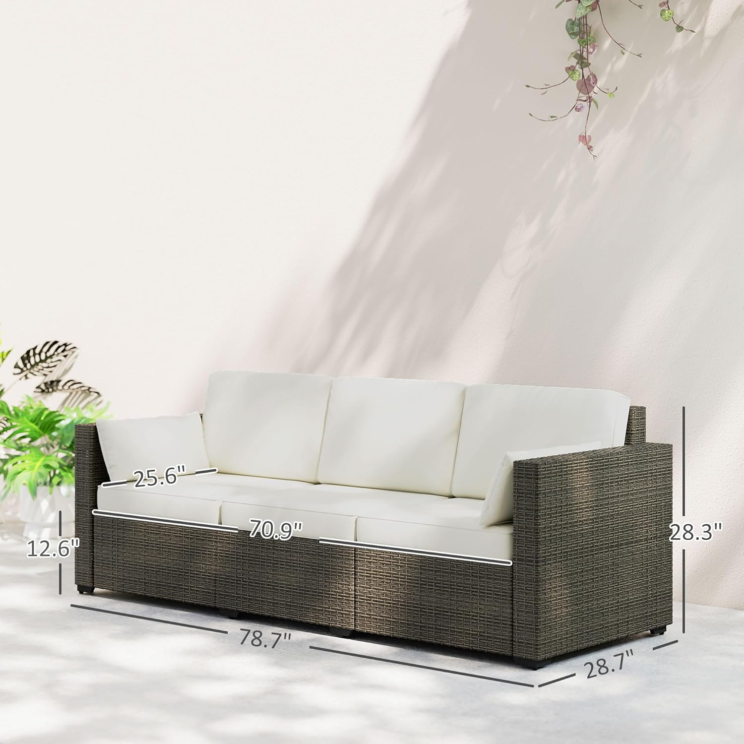 Outdoor Couch Info: Overall: 78.7″ W x 28.7″ D x 28.3″ H. Seat: 70.9″ W x 25.6″ x 12.6″ H. Weight Capacity: 792 lbs. Assembly required. NOTE: To prolong the service life, we recommend using a furniture cover when not sitting on it.