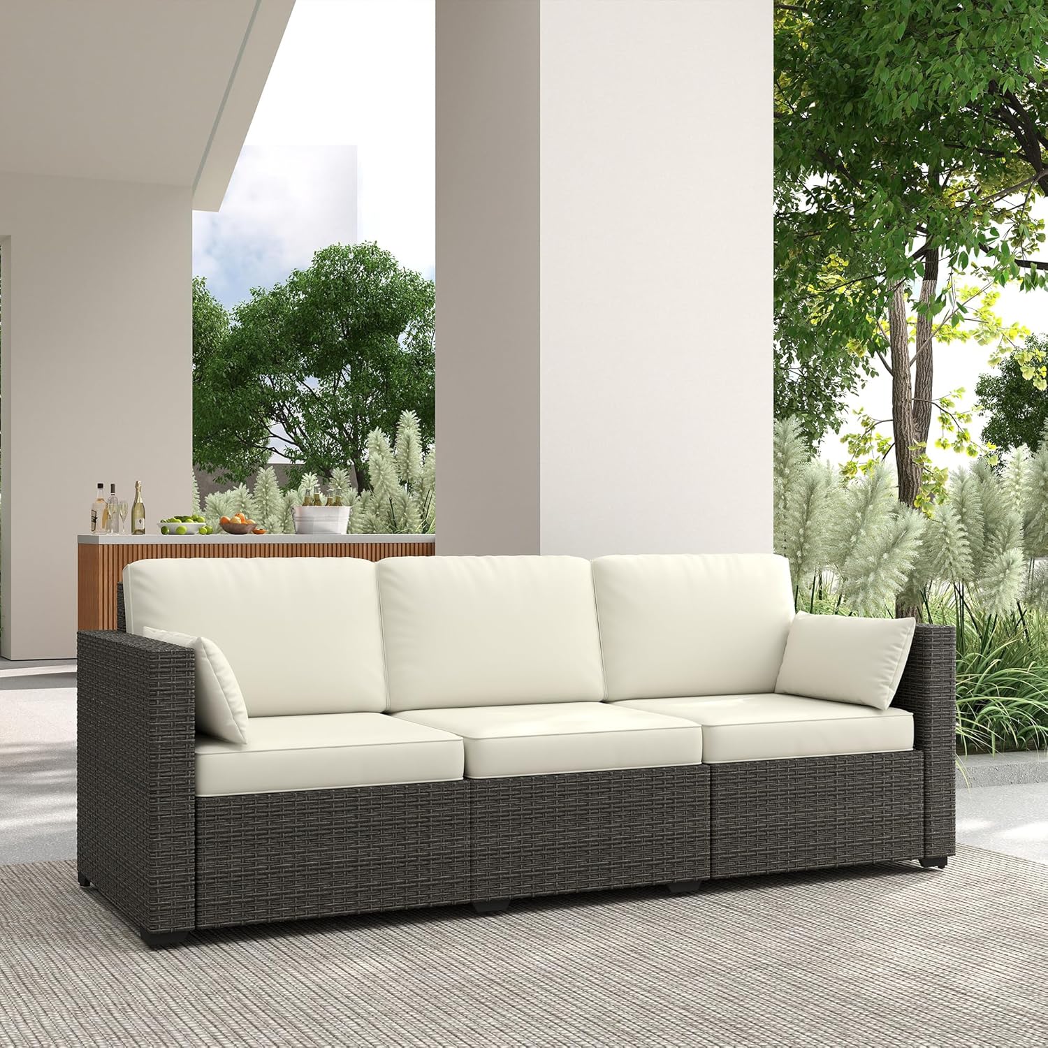 Comfy Seating: Our outdoor couch brings indoor comfort outside. Each seat is plushly padded. Cushions on the back are soft yet supportive, and pillows on the side let you adjust or lay your head. Remove the covers, and cleaning is easy.