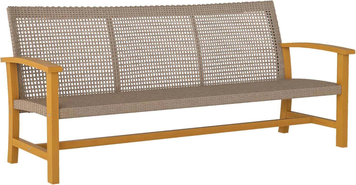 Elevate your outdoor lounging with the Outsunny wicker outdoor sofa, designed to seat three people comfortably. This steel outdoor couch seat wrapped in handwoven double-strand plastic wicker supports up to 1000 lbs. and offers a timeless and classic look. The acacia wood-accented porch couch adds rustic charm to any setting. Designed for effortless assembly, this balcony couch sofa lets you relax in comfort with minimal effort and make every relaxing moment unforgettable.