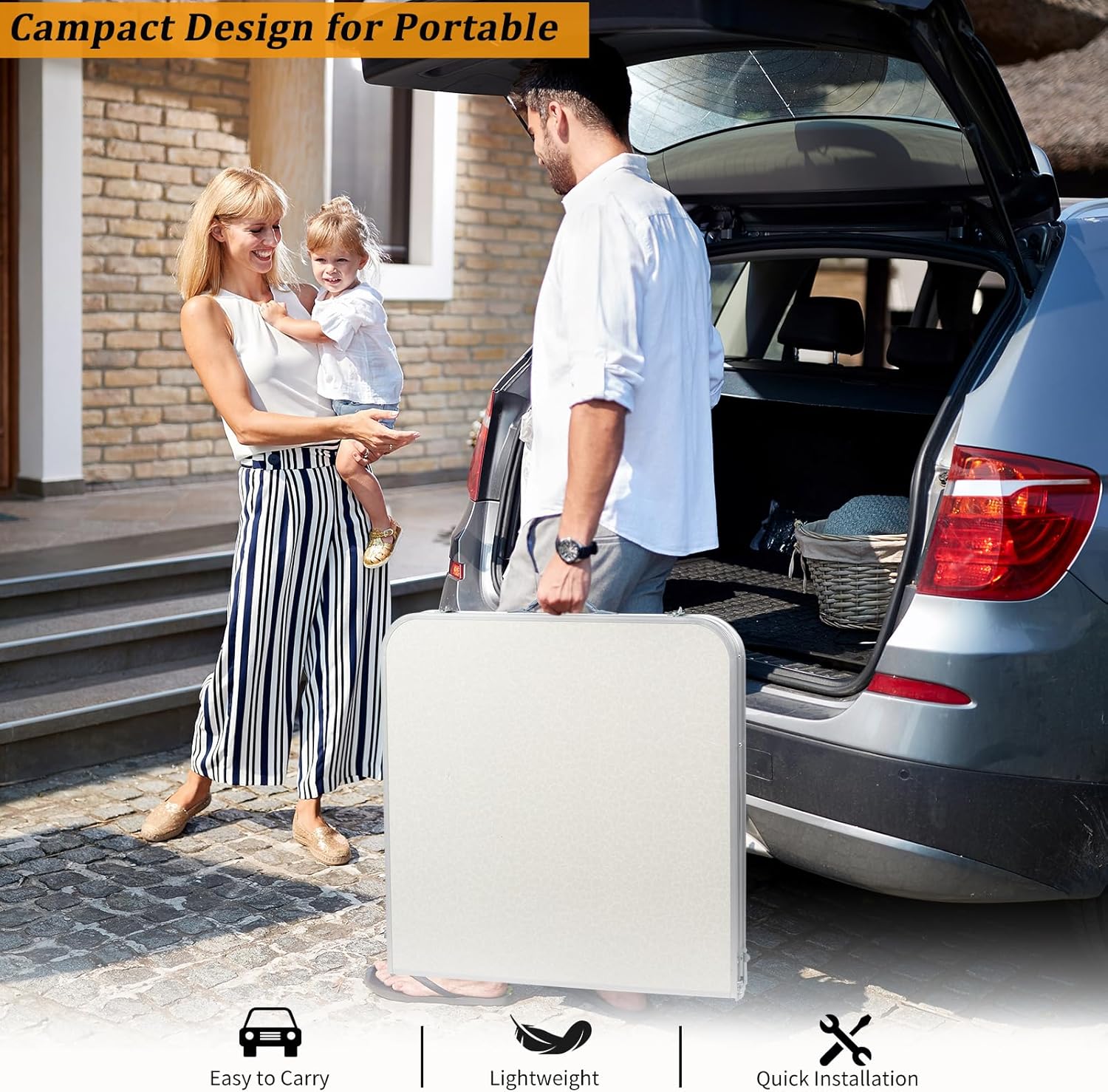 【CONVENIENT DESIGN】The rv outdoor table can be easily opened in seconds with just a few simple steps. Quickly fold with the side locks and carry handle. The desktop features fiberboard that is easy to clean stains only by swiping. The 4ft folding table provide convenience in a variety of places for you
