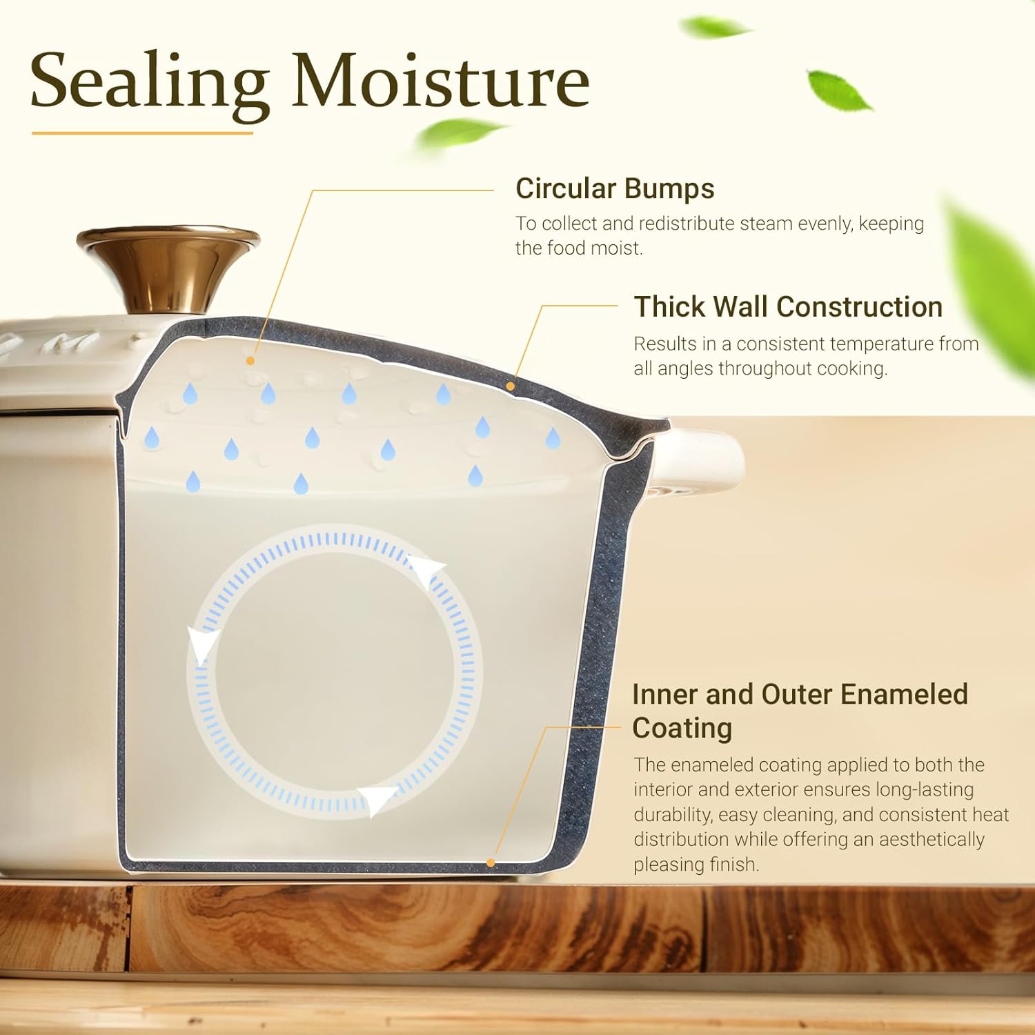 Universal Compatibility: Our premium enamel Dutch oven is designed to shine on various stovetops, including gas, electric, ceramic, and even induction. Plus, it’s oven safe up to 500℉, offering an exceptional range of cooking options.