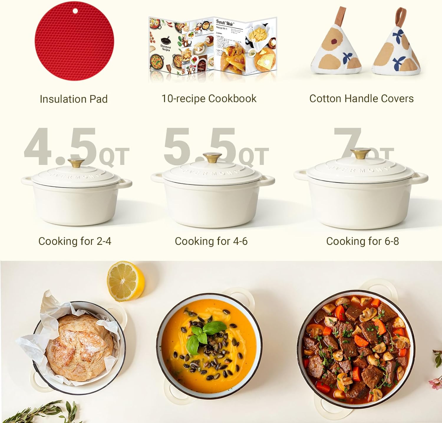 Overmont Enameled Cast Iron Dutch Oven – 5.5QT Pot with Lid Cookbook & Cotton Potholders – Heavy-Duty Cookware for Braising, Stews, Roasting, Bread Baking white