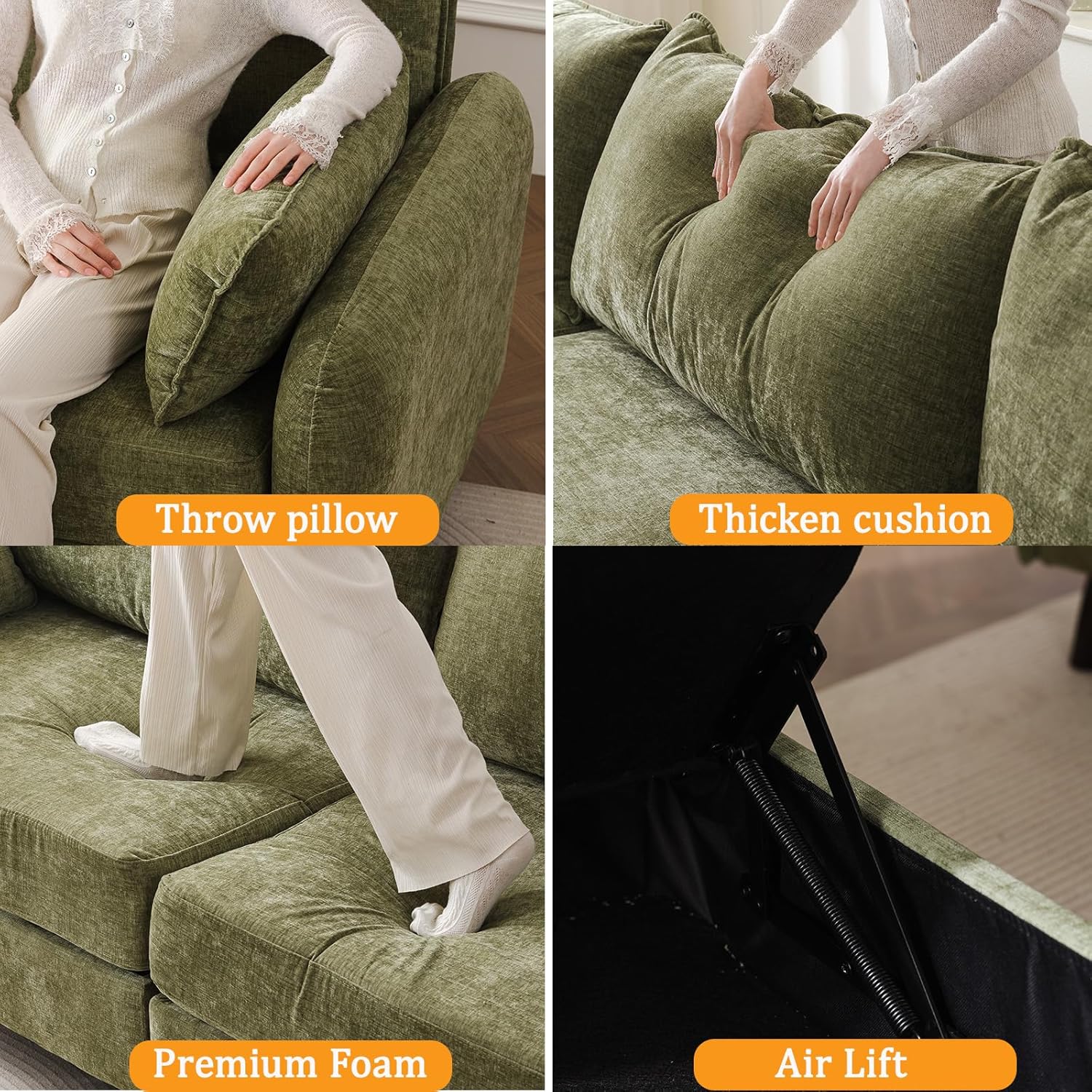 Huge Storage Under Seat: This large chair features a spacious STORAGE compartment, providing a practical solution for organizing blankets, pillows, or other essentials, keeping your living room tidy.Storage dimensions: 31‘‘(L)*31‘‘(W)“*7“(H).