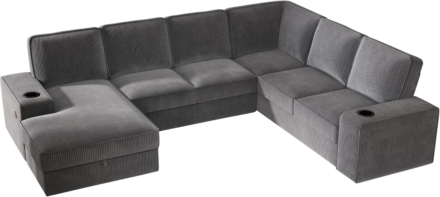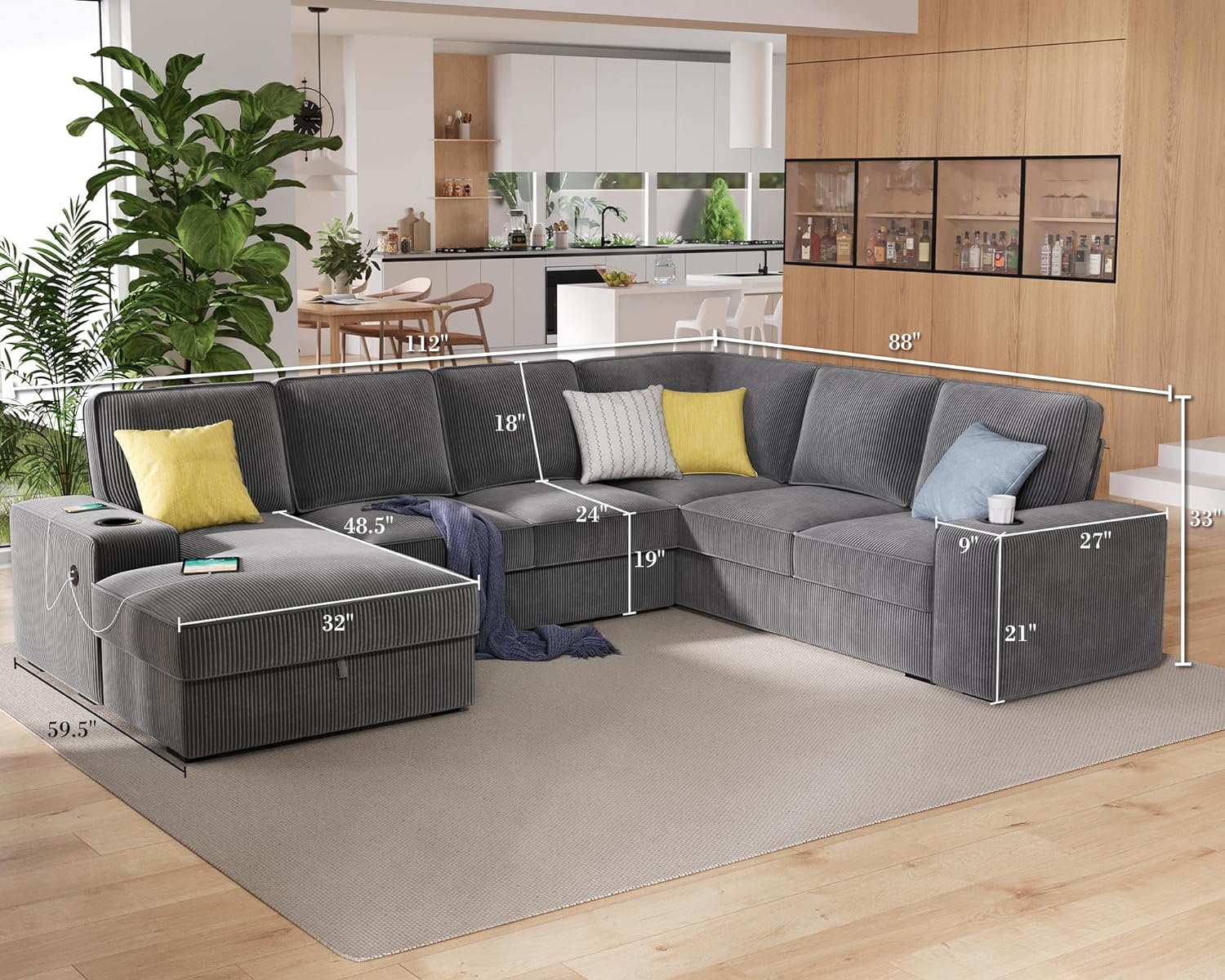PaPaJet U Shaped Couch, 112 Inch Oversized Couch with Storage Chaise, Sectional Sofa with Cup Holders & 2 USB Ports, Corduroy Grey Sofa