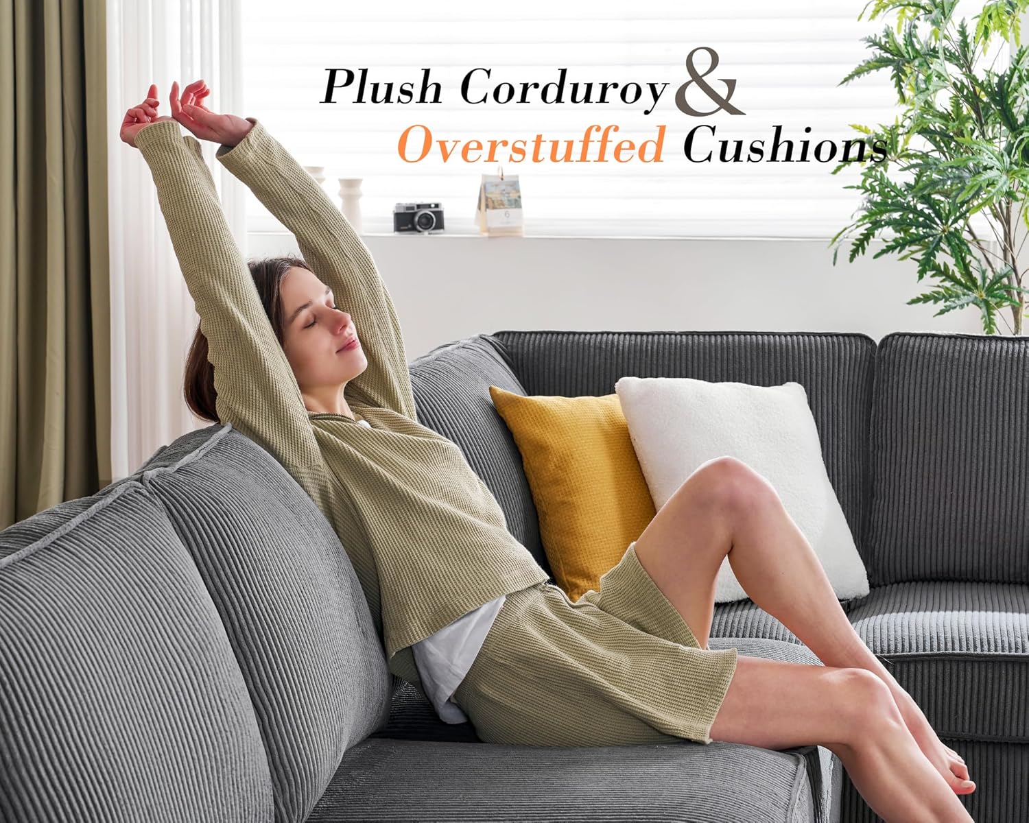 Premium Corduroy & Thick Cushions: Indulge in a truly luxurious seating experience with 8-inch thick cushions filled with high-density foam. Covered in ultra-soft Corduroy, the upholstery not only provides warmth and comfort but also enhances the corner sofa’s plush, inviting feel.