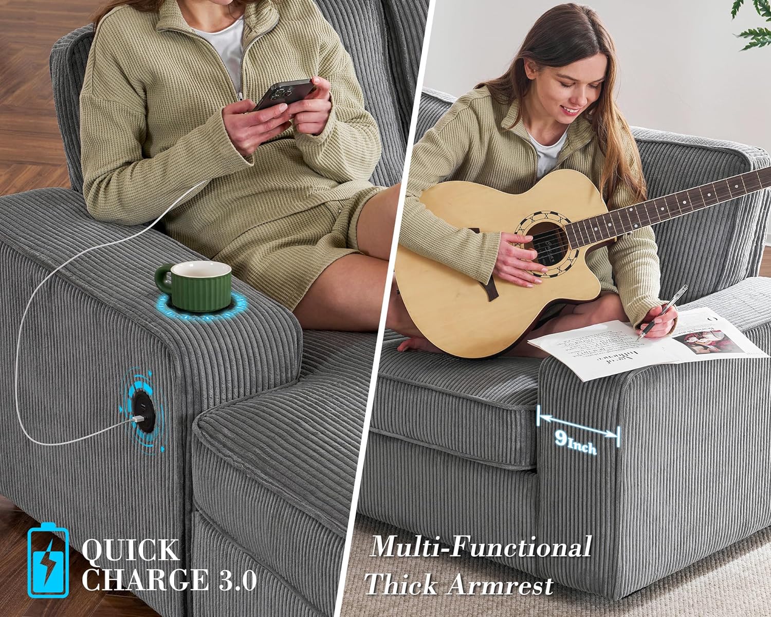 Multi-Functional Armrest Features: Corduroy sectional sofa is designed for convenience, with built-in USB charging ports so you can power your devices without leaving your seat. The integrated cup holders ensure your drinks are always within reach for an easy-going, laid-back experience.