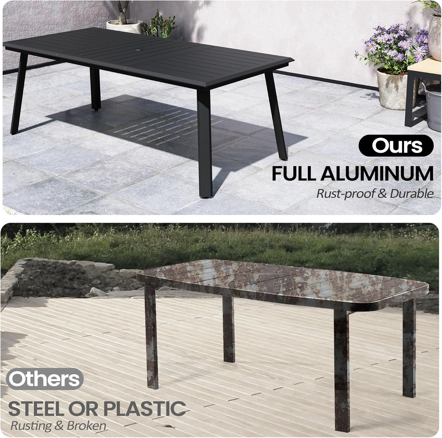 All-Weather Material: All-aluminum dining table, lightweight yet high-strength aluminum frame ensures stability, the black powder coating provides superior durability and corrosion resistance – a patio table that defies the seasons