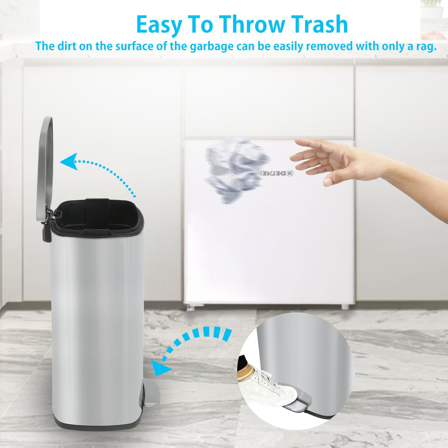 Improve your trash management with this 13-Gallon (50L) Stainless Steel Trash Can. The easy-to-clean surface repels fingerprints and stains, and the tight-fitting lid effectively eliminates odors, keeping your home fresh. This long-lasting can is made of high-quality materials and has a sleek, modern style that will blend in with any decor. This multipurpose garbage can is ideal for kitchens, offices, and other settings, thanks to its simple foot pedal for hands-free operation.