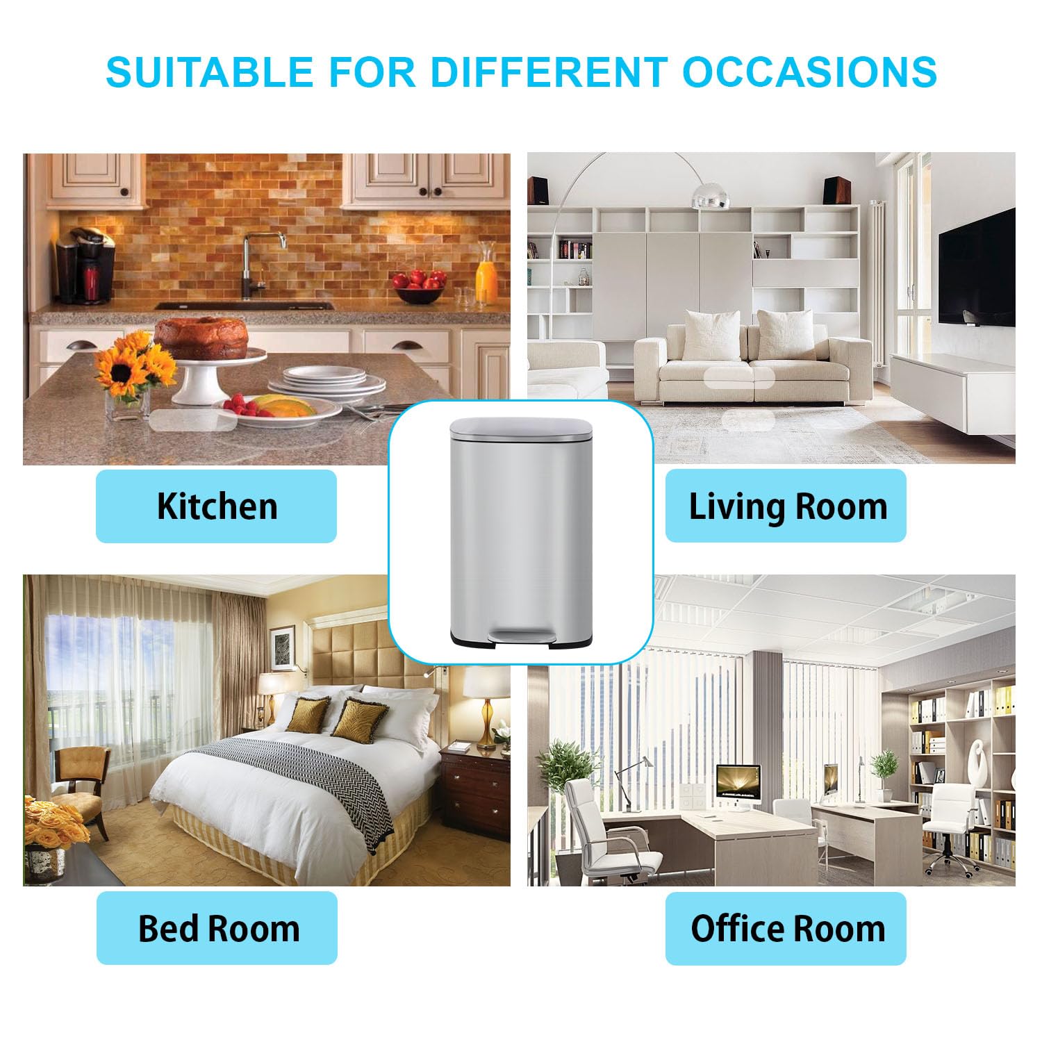 13 Gallon Ultra-large Capacity: 13 gallons can absolutely meet your daily use, in the kitchen table next to a kitchen trash can, you will be more convenient to deal with kitchen waste. The regular 13-gallon garbage bag in the supermarket can be used in our stainless steel trash can, and it’s kind of you to use a bigger bag. The lid of the garbage can is removable, it’s convenient for you to put in and take out the garbage bag.step trash can kitchen trash can bedroom trash can