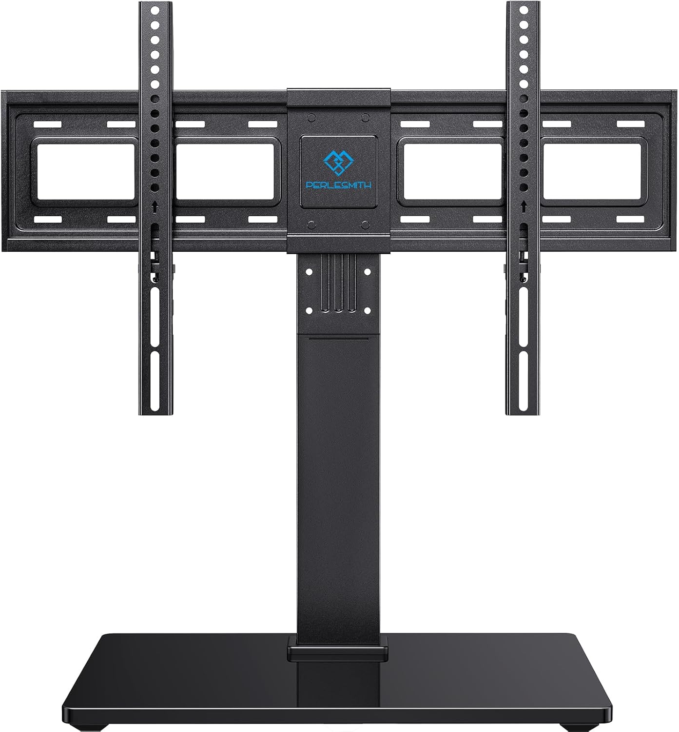 【9 HEIGHT ADJUSTMENT POSITIONS & INSTALLATION】PERLESMITH universal TV stand makes your life easier. 9 different positions and total 8” of height movement is perfectly for the TV it was needed for. Highest level fits Large TVs and lowest level to keep it from tipping. This tv stand base is also super easy to install within 15 mins without any hassle and comes with a clear instruction.