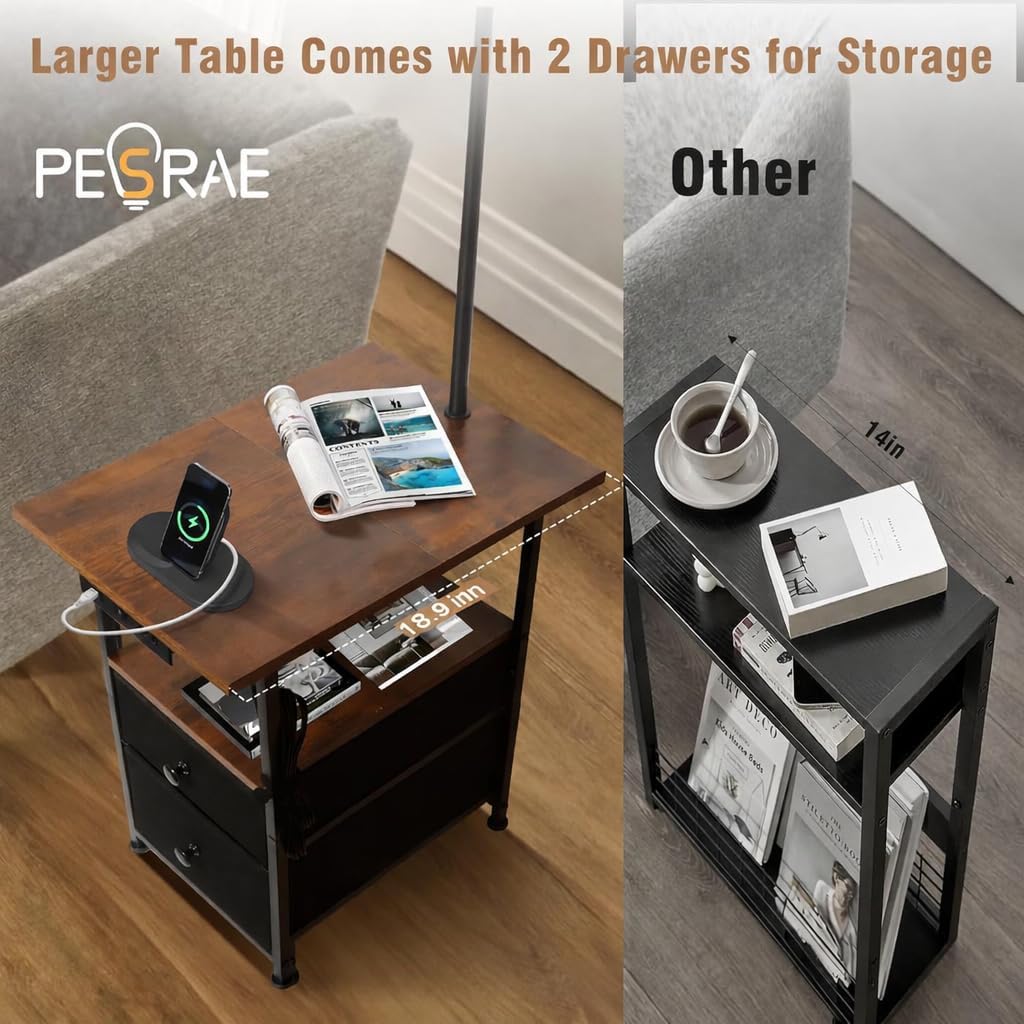 PESRAE Floor Lamp with Table & 2 Drawers, End Table with 3 Color Temperature Reading Light, Side Table Lamp with USB & Type C & AC Charging Port for Living Room, Bedroom