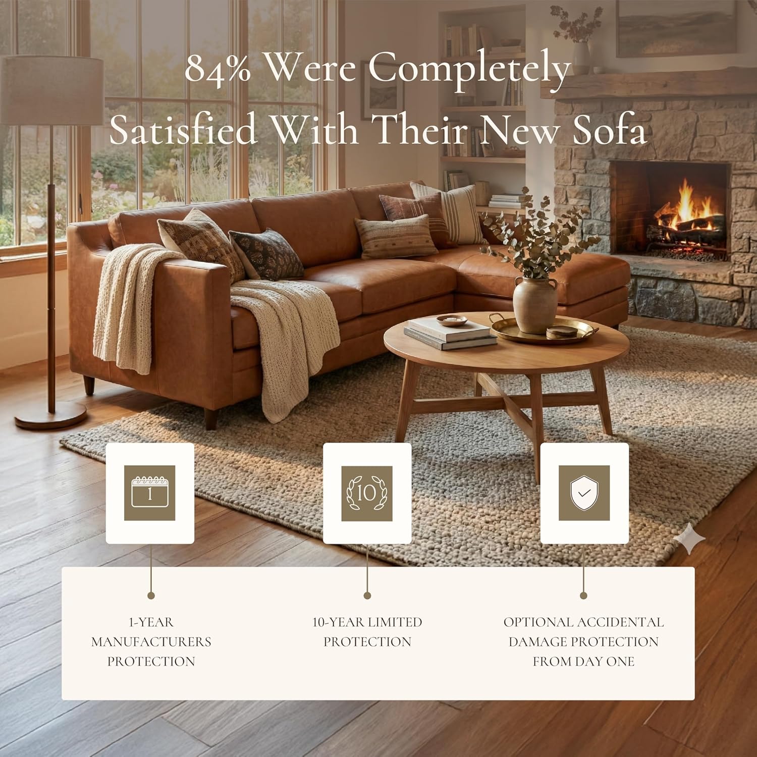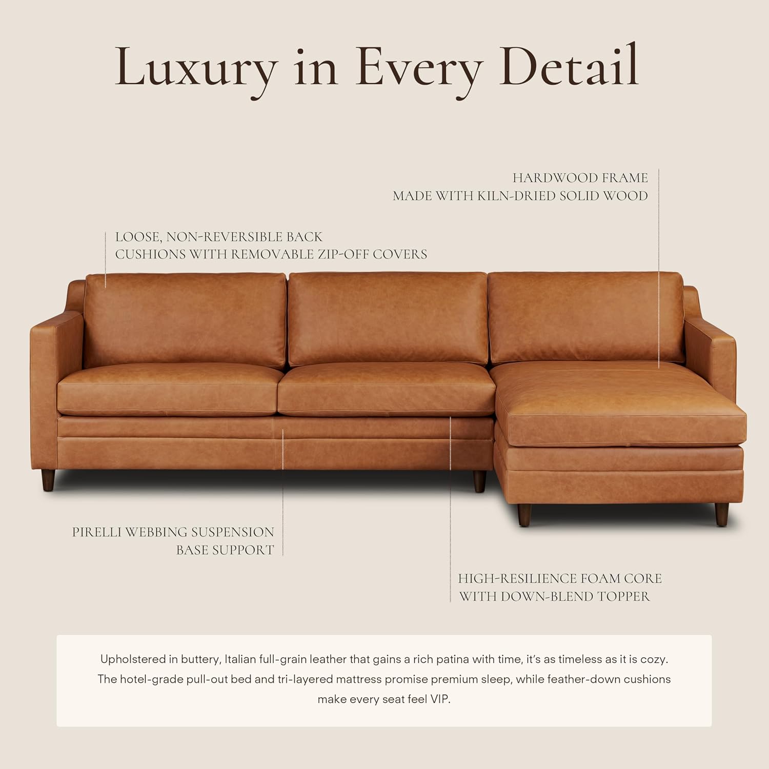 Full-grain leather that evolves: Upholstered in premium full-grain, aniline-dyed leather, the Sorrento celebrates natural tone variation, subtle marks, and a patina that deepens over time. This isn’t coated or overly processed leather. It’s raw, expressive, and meant to be lived in. Over months and years it’ll gain character that reflects your use and the light in your space.
