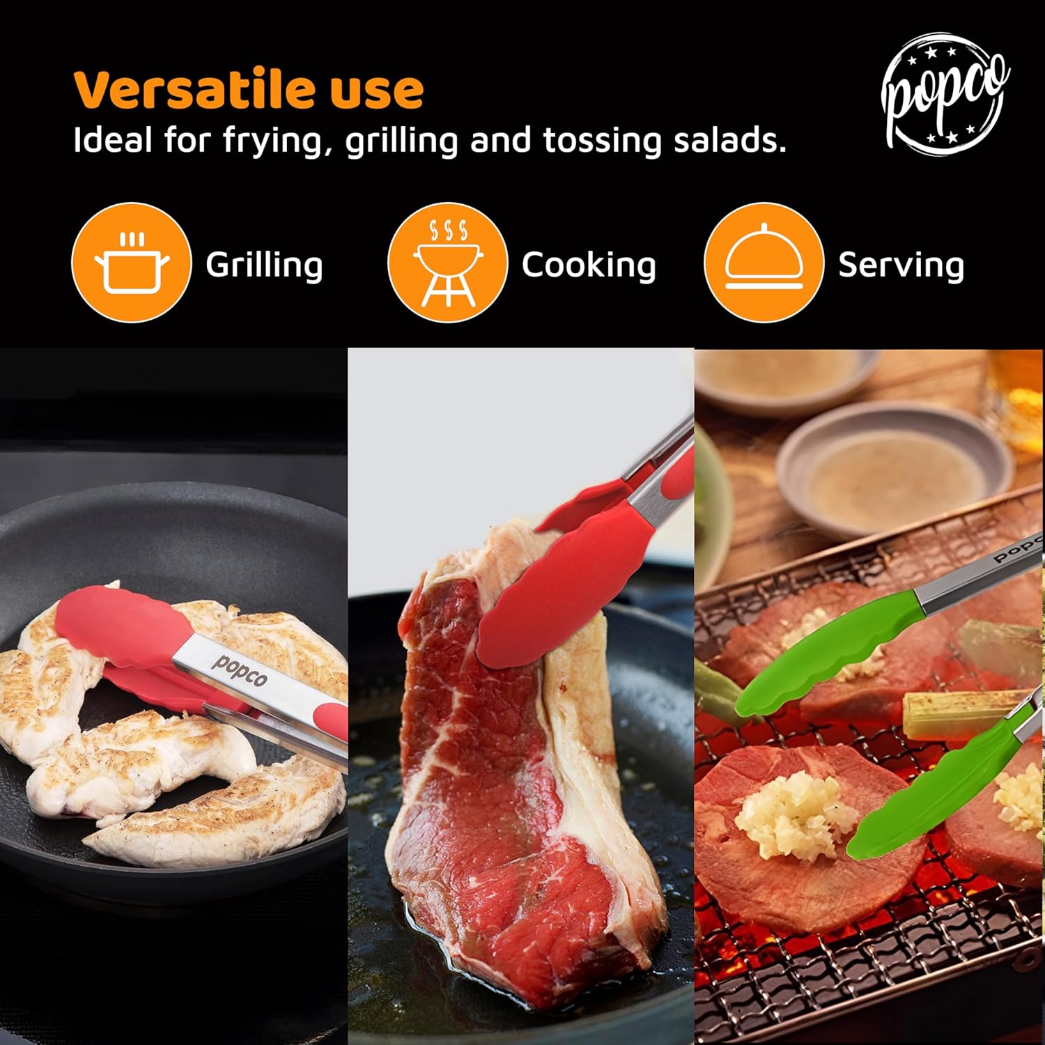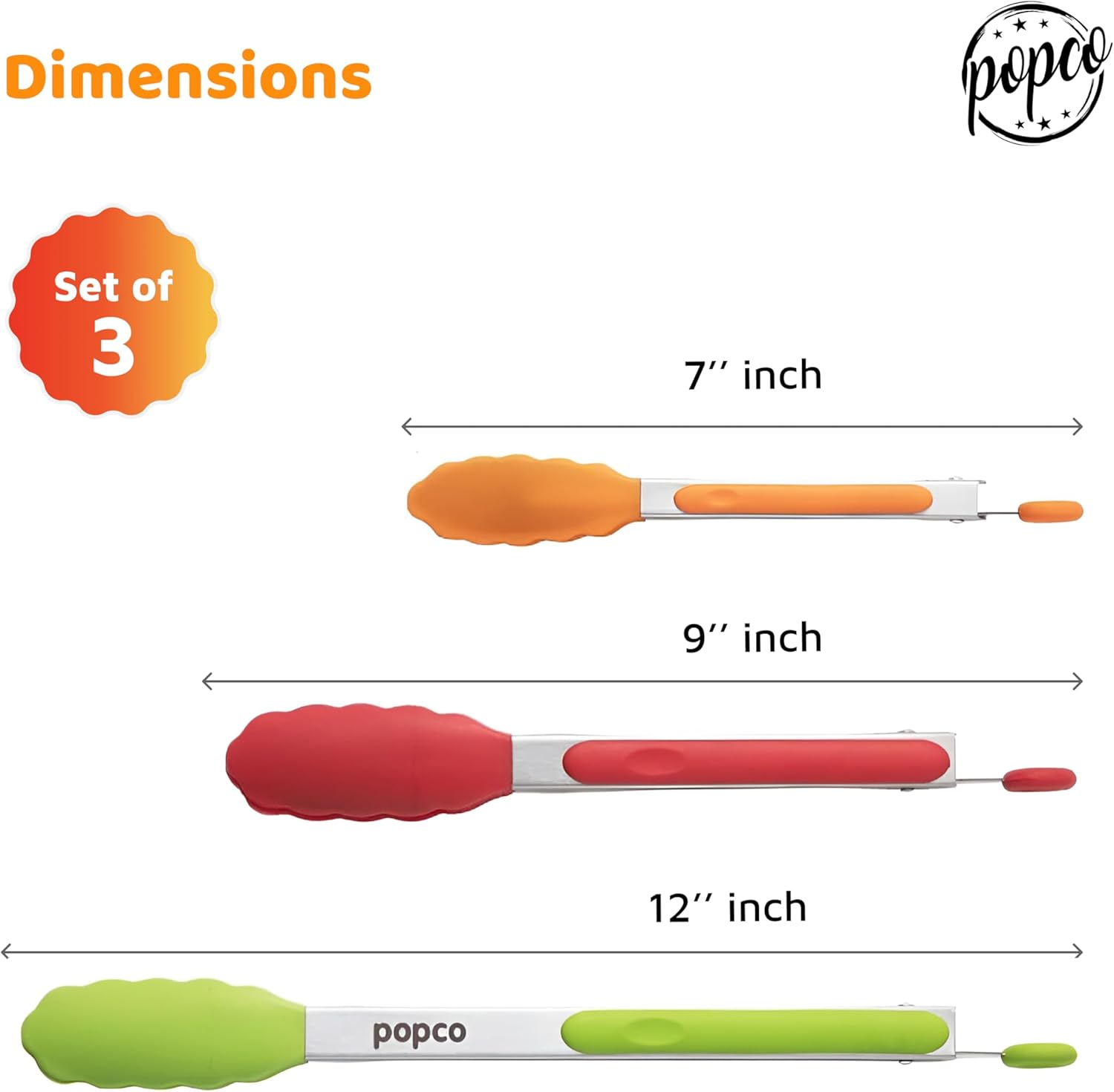 Popco 3 Piece Kitchen Tongs Set 7, 9, 12 Inch – Stainless Steel Nonstick Tongs with Silicone Tips – Heat Resistant and Dishwasher Safe for Cooking, Grilling, Salad, and Everyday Serving