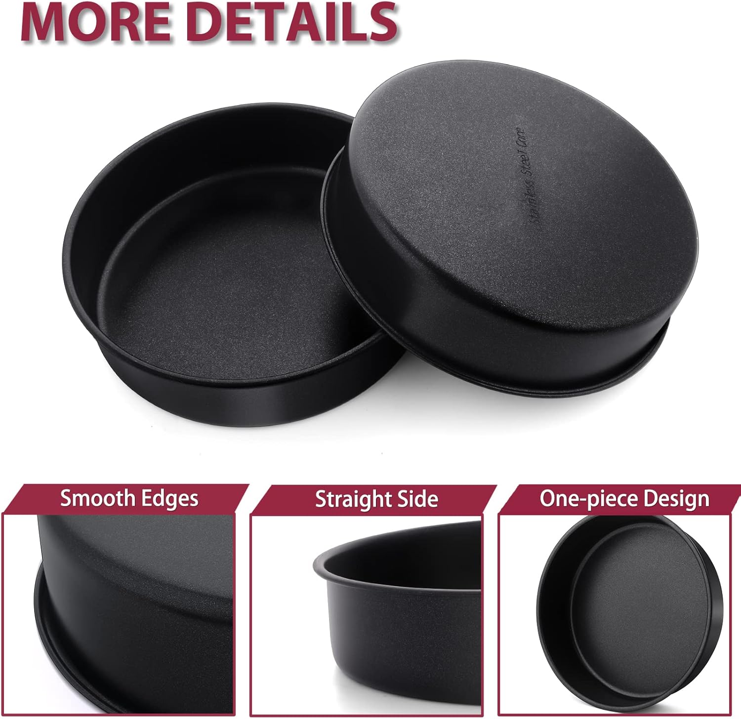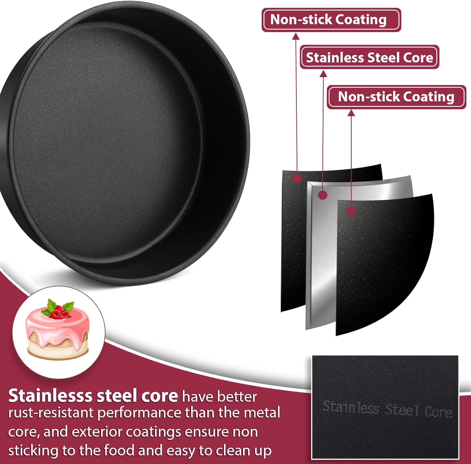 【STURDY STEEL CORE】The round cake pans are constructed by heavy-gauge stainless steel core, To avoid deformation and warp resistance, Good heat conduction to spread the heat evenly and quickly, Easy to shape of the cake, Compared to other metal or aluminium core pans, They are rust-free and could be durable for a long service life, Oven, air fryer, pot and freezer safe