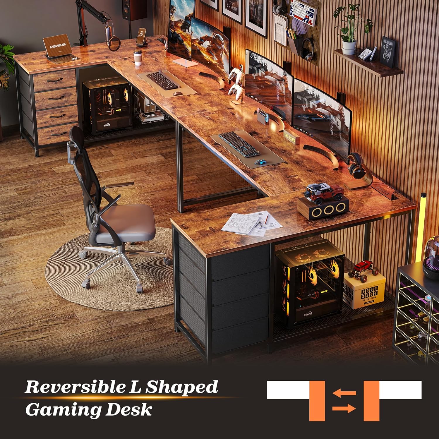 【Oversized Desktop & 4-Drawer Storage】Working in a small room? This l shaped office desk offers a wide surface. Main desk fits dual monitors, keyboards, or gaming setups. Side desk holds your printer, notebooks, or a second laptop. 4 fabric drawers and 2 open shelves (adjustable wood & mesh shelf) of the corner gaming desk give you the storage flexibility you need or remove shelves entirely for tower PC space
