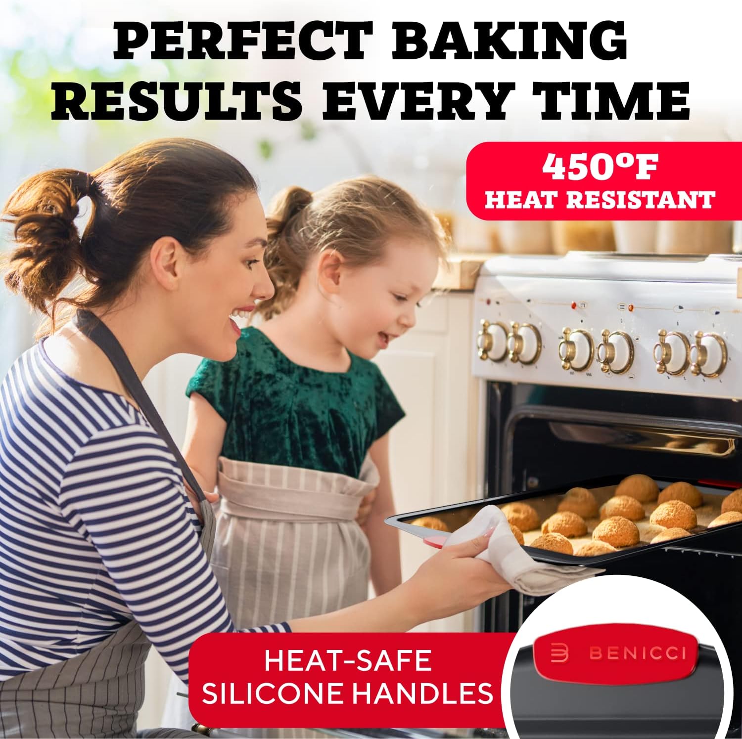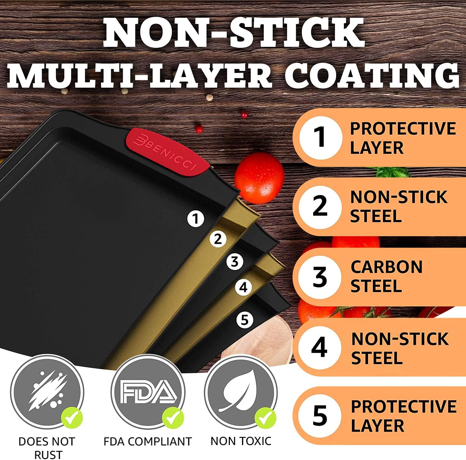 COOKIE SHEET – Made to last for longer: Crafted with 0.5mm carbon steel with non-stick grey coating, our baking sheet set can stay with you for many years. They’re guaranteed oven-safe up to 450 °F (232°C).