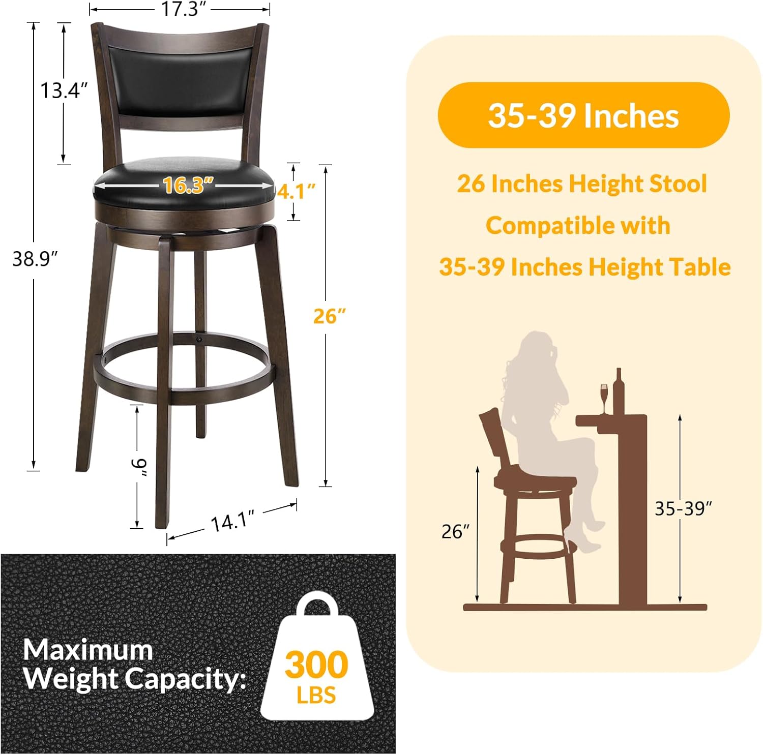 PrimeZone Swivel Bar Stools Set of 4, 26 Inch Counter Height Barstools, Black Faux Leather Bar Stool with High Backrest & Solid Wood Legs & Wrap-around Footrest, Counter Stools for Kitchen Island, Pub