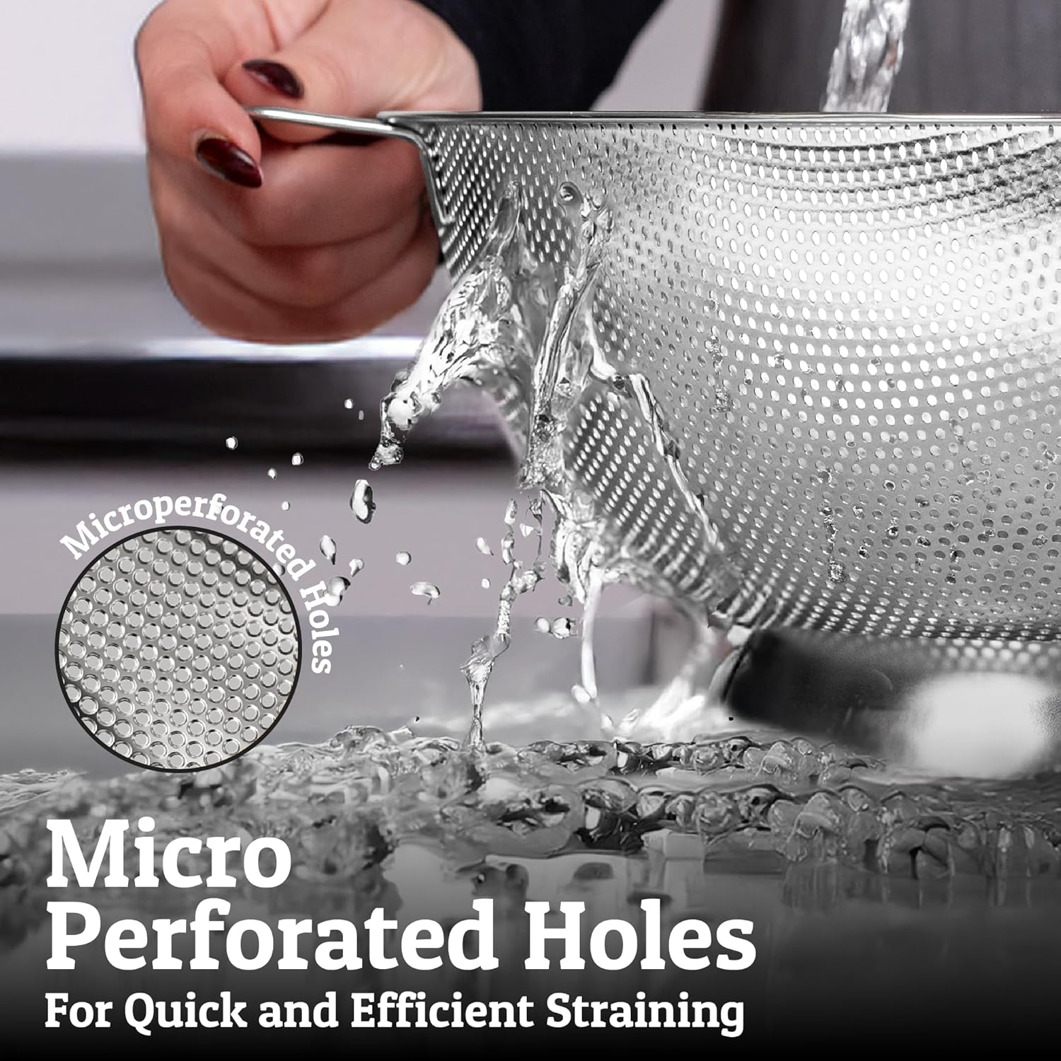 Fast Draining Micro-Perforations – This stainless steel kitchen strainer ensures quick and efficient draining for everyday cooking. No more lost pasta! Ideal for rinsing small fruits and vegetables, but not recommended for super-fine grains like quinoa or couscous.