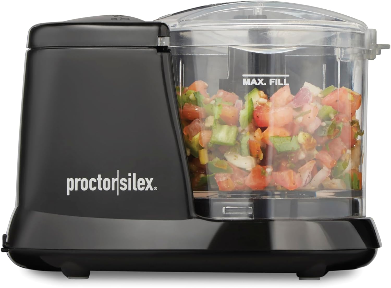 The Proctor Silex 1. 5 Cup Food Chopper is the perfect size for everyday use. It’s great for chopping onions, making salsa, pureeing baby food, emulsifying sauces, and more. It has stainless steel blades, simple pulse control, and is easy to clean.