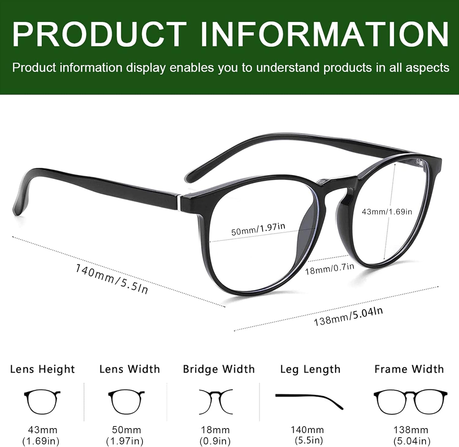 Medium Size – Suitable for Most People,But can not Fit Very Big or Small Face.Product Dimension-Lens Width: 50mm(1.97inches), Lens Height: 43mm(1.69inches), Temple Length: 140mm(5.51inches), Nose Bridge: 18mm(0.9inches), Frame Width:138mm(5.04inches).