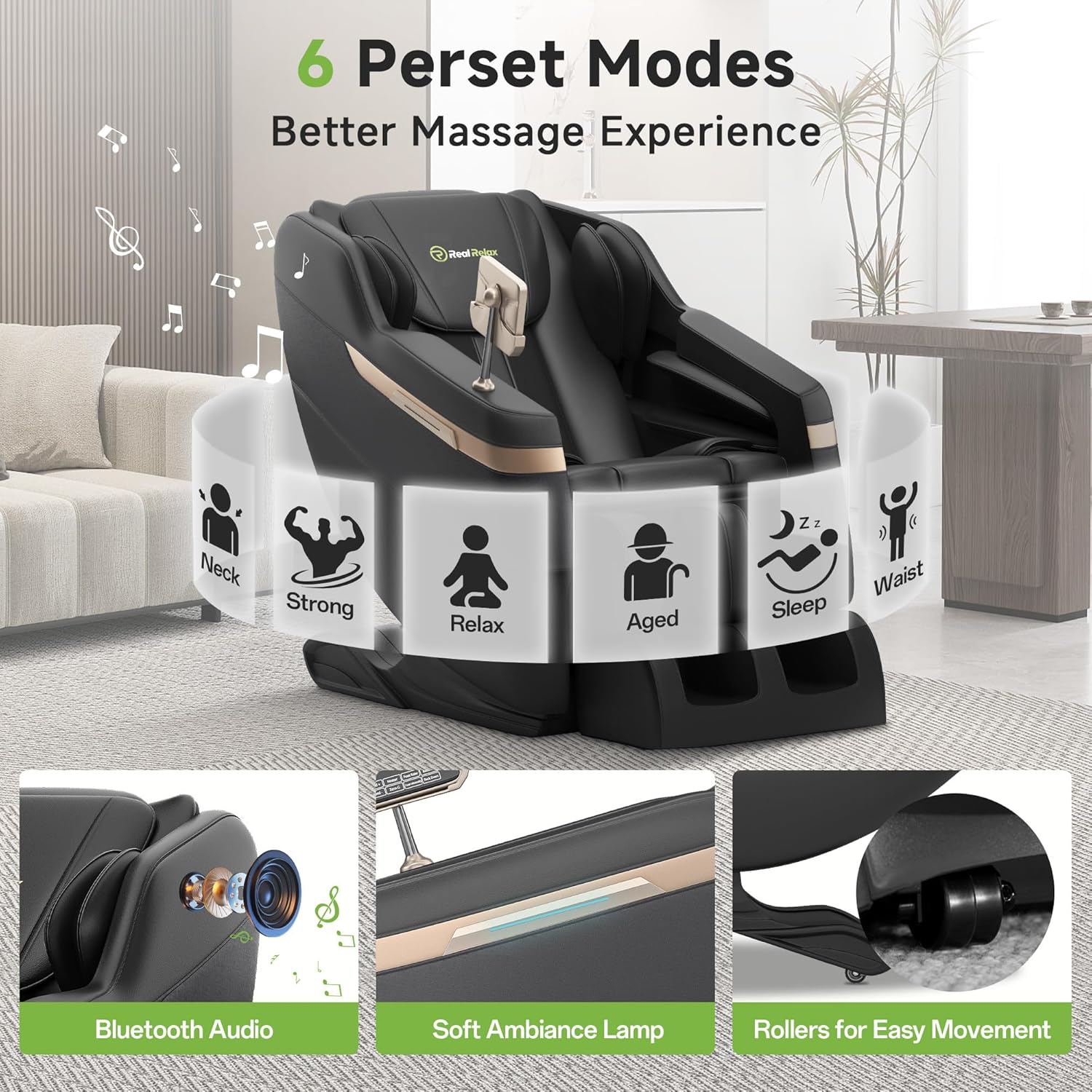 Real Relax 2025 Full Body Massage Chair, Zero Gravity Shiatsu Massage Chair Recliner, Waist and Calf Heating, Foot Massage, Bluetooth, Large Control Screen (Black and Gold)