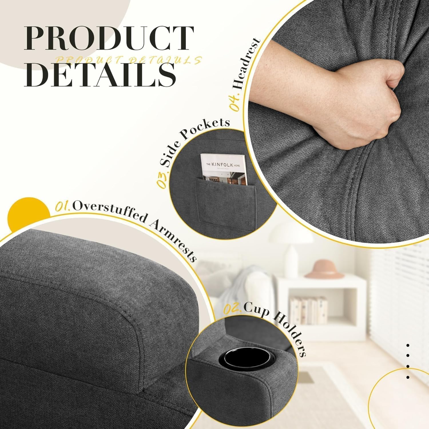 SIDE POCKETS & CUP HOLDERS – The rocking chair is equipped with 4 side pockets and 2 cup holders to provide ample storage for your essentials, and the angled cup holders are positioned for easy access to beverages. The clever storage design improves the usability of the space and ensures that everything stays neat and organized while you relax.