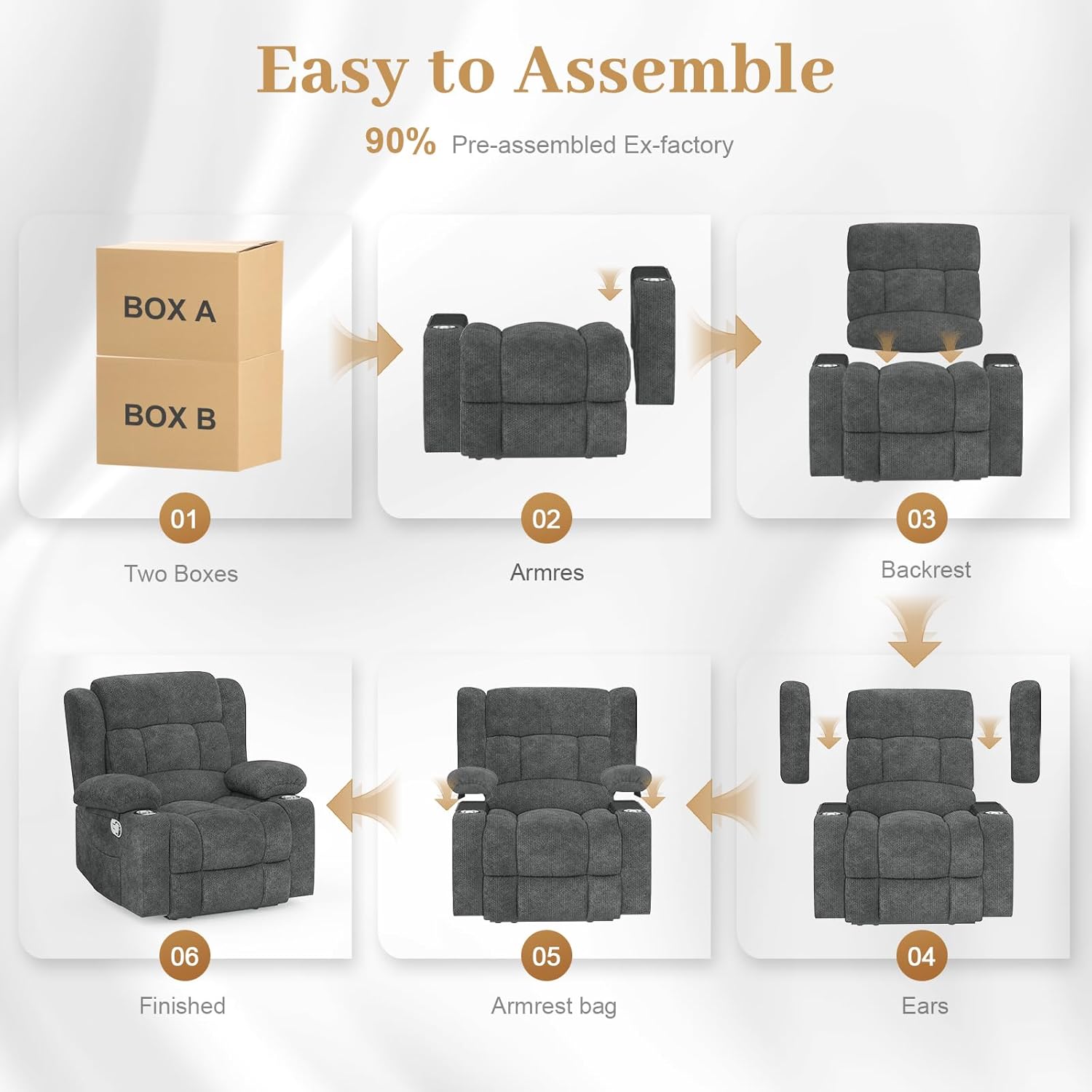 EASY TO ASSEMBLE: Our recliner chair is 90% pre-assembled design, you can easily assemble it in just 10 minutes, which greatly saves your time and energy, let you say goodbye to the annoying behavior of searching for the right parts inside the complicated accessories. A detailed instruction manual is included in the package to bring you further help in assembly. Note that this recliner is divided into two packages and may not arrive on the same day.