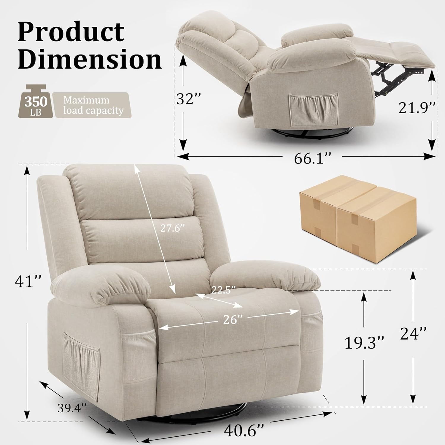 【360°Swivel Rocker Recliner】If you’re looking for a recliner that offers effortless 360° rotation with a sophisticated and elegant appearance, our rocker recliner chair is the perfect choice. Whether you’re reclining to stretch out or enjoying the swivel and rocking functions, this multifunctional recliner will provide you with ultimate comfort and enjoyment. Our recliner has passed weight testing experiments with a maximum weight capacity of 350 lbs, ensuring exceptional stability and safety.