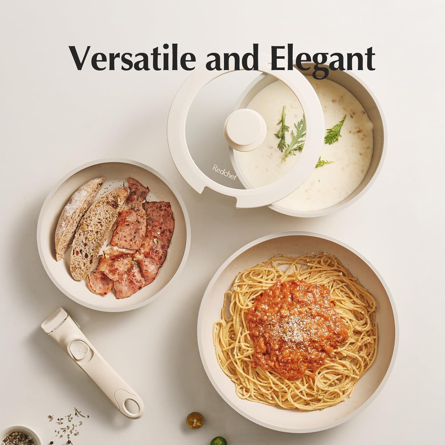 Natural Dual-Sided Ceramic Coating: Redchef ceramic pots and pans set boasts an innovative dual-sided ceramic coating, inside and out; This advanced ceramic finish ensures effortless cleaning, allowing you to effortlessly wash both the interior and exterior of your pots and pans