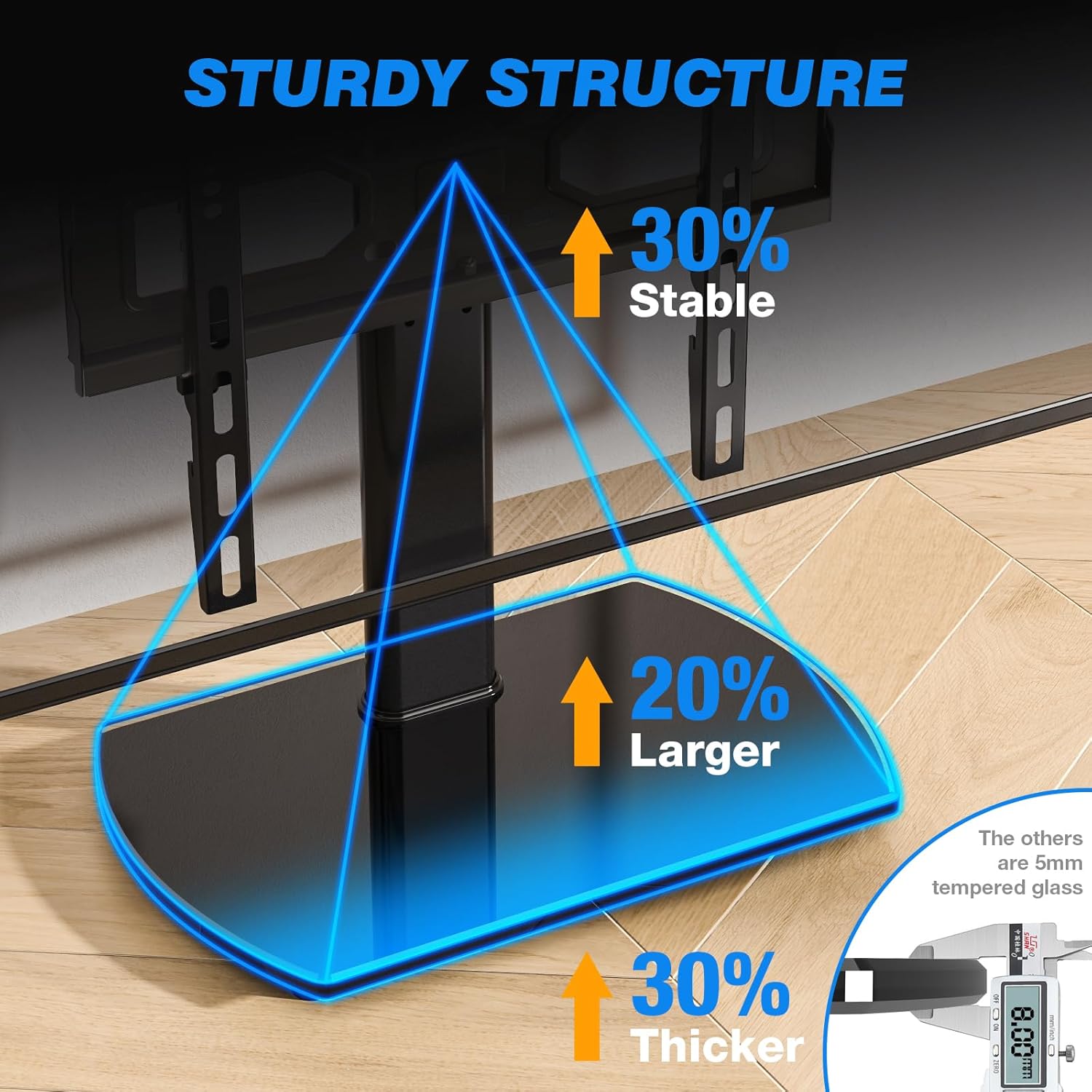 STRONG STRUCTURE: The weight capacity of this TV stand mount is 88lbs. The whole table top TV stand including brackets and pole is made by heavy duty strong steel. The universal swivel table top tv stand is constructed with high-strength tempered glass with a thickness of 8mm, which is more resistant to pressure and impact and dramatically improves safety. The assembly is very easy. Please refer to the installation video to complete the mounting of the tv stand base replacement