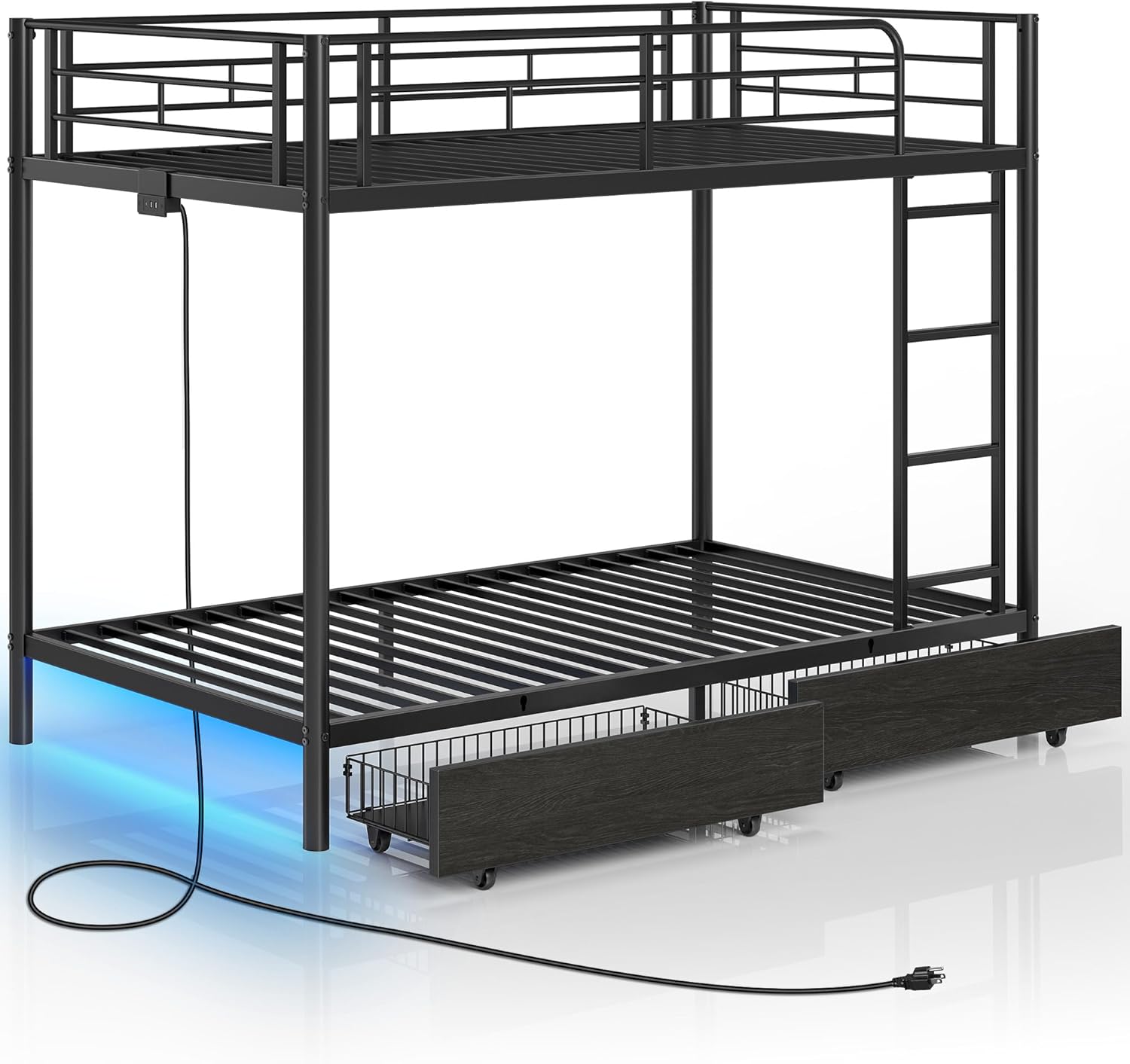 Rolanstar Metal Bunk Bed Twin Over Twin with USB Charging Station, LED Bunk Bed with 2 Storage Drawers, Bed with Safety Guardrail & Ladders, No Box Spring Needed, Easy Assembly, Black