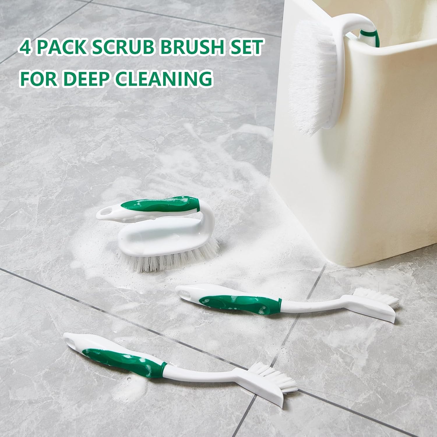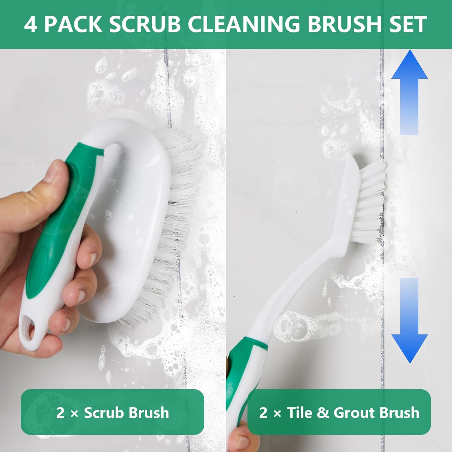 Scrub Brush Set, 4 Pack Deep Cleaning Brush Kit – 2 Scrub Brush, 2 Tile & Grout Brush with Built-in Scraper, Household Commercial Scrubber for Floor, Shower, Pool Wall, Tub (Green)